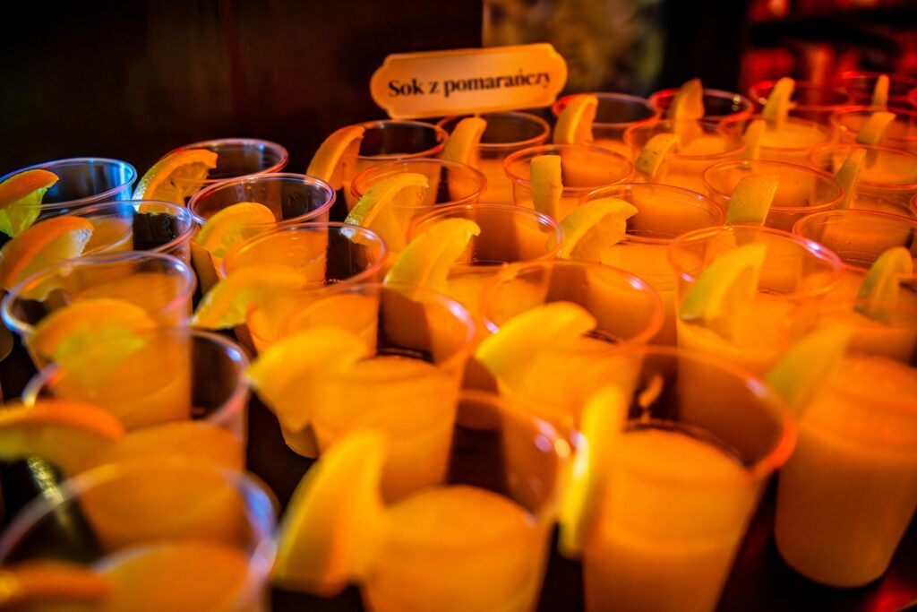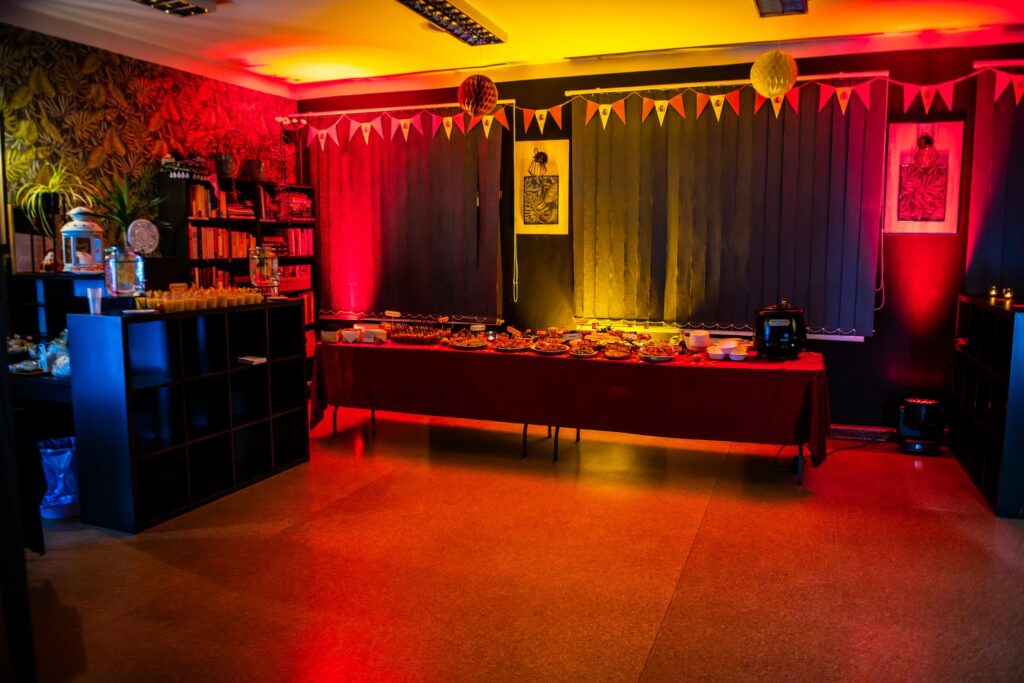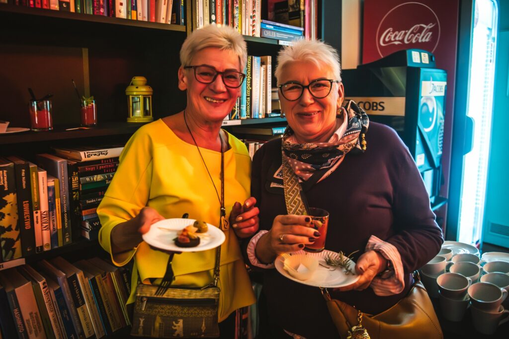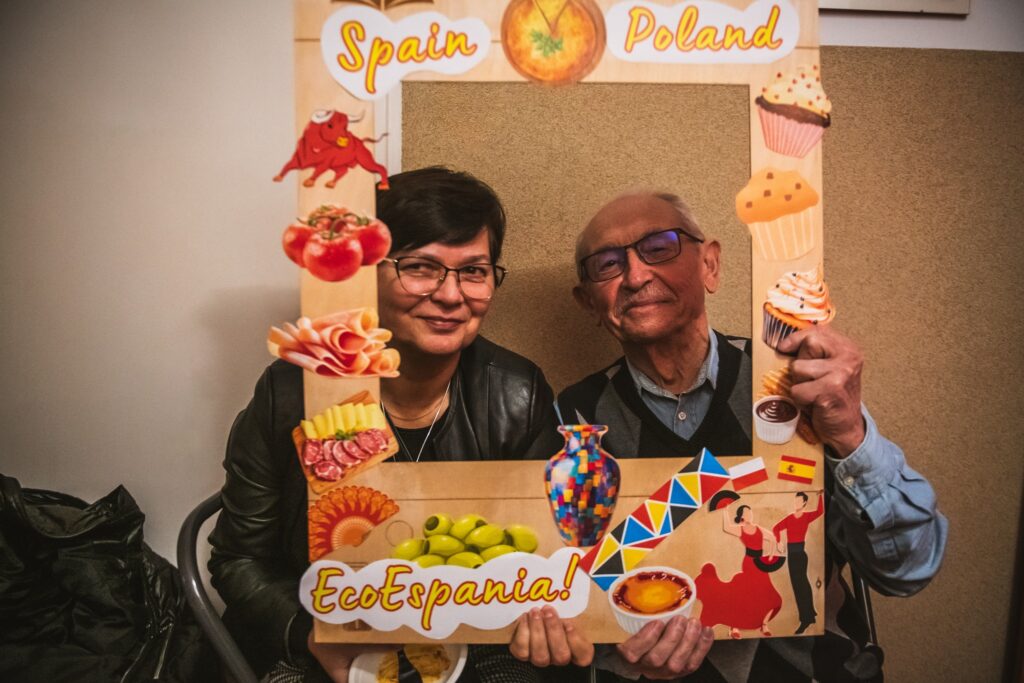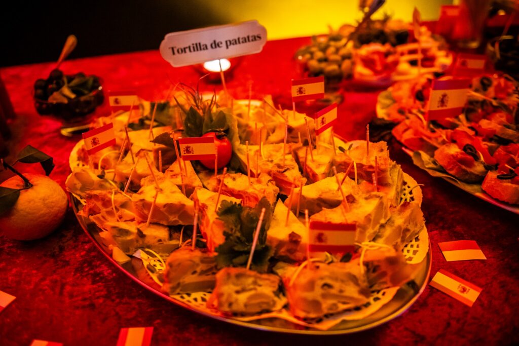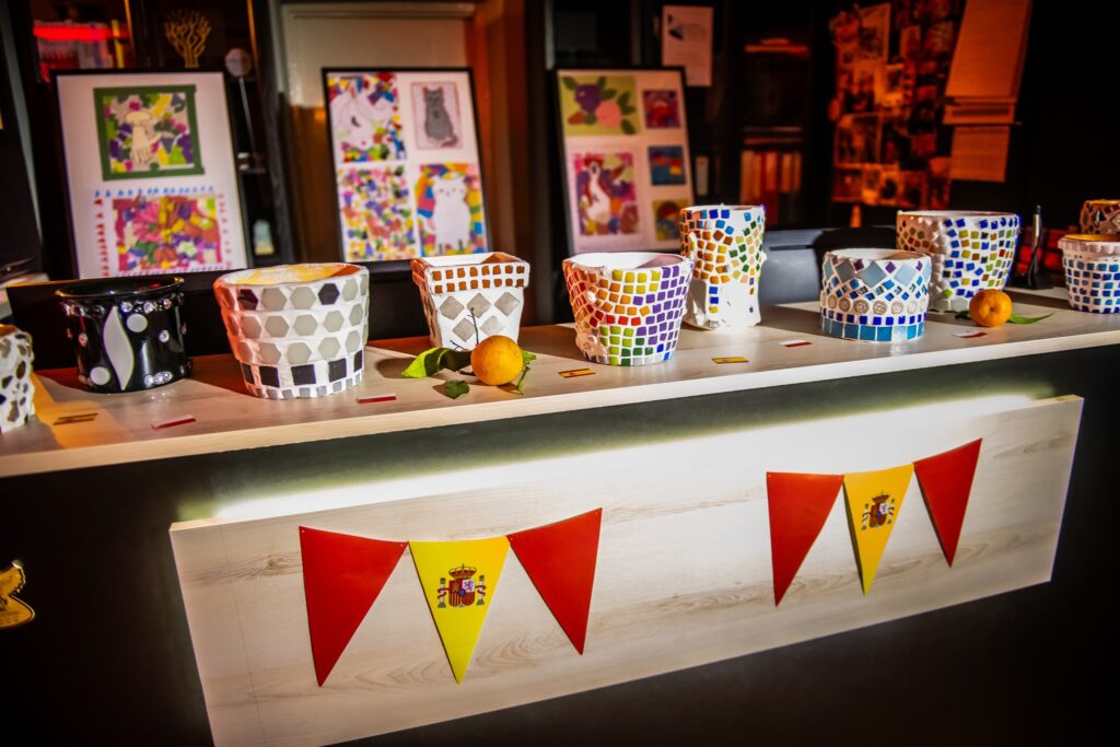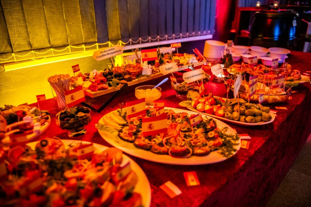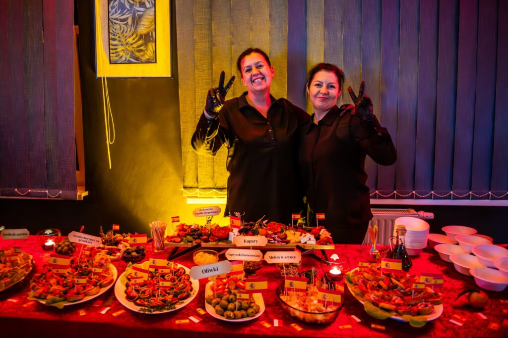 Wieczór zakończył się poczęstunkiem, na którym serwowano hiszpańskie specjały, takie jak gazpacho, paella z kurczakiem i chorizo, tortilla de patatas, babeczki magdalenas, szynka iberyjska na grzankach, melon w szynce, deska serów i wędlin hiszpańskich oraz świeżo wyciśnięty sok z pomarańczy. Poczęstunek został przygotowany przez grupę „Kulturalnipl” i pracowników biblioteki, podkreślając kulinarną różnorodność Hiszpanii. Można też było podziwiać prace uczestników warsztatów rękodzielniczych – mozaiki hiszpańskiej.