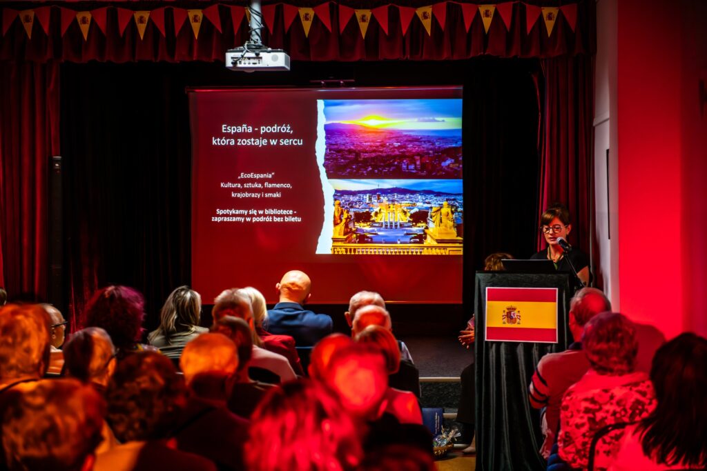W programie wieczoru znalazła się interesująca prezentacja poświęcona Hiszpanii przygotowana przez dyrektor biblioteki Annę Gałązkę. Przybliżono kulturę ojczyzny Cervantesa, a także ciekawostki związane z tym krajem. Prezentacja była urozmaicona pokazem tańca flamenco w wykonaniu grupy tanecznej Baila Conmigo z Drawska Pomorskiego prowadzonej przez Iwonę Makowską, a zakończona loterią fantową à la „El Gordo”. Podczas jednego z tańców zaprezentowały się również uczestniczki warsztatów tańca flamenco.