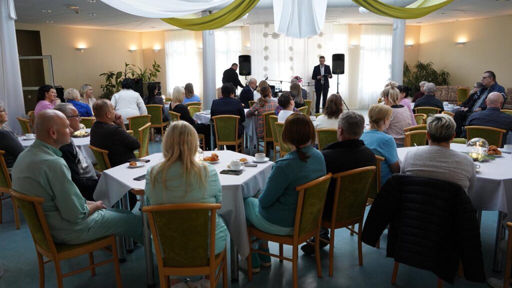 Po części oficjalnej przyszedł czas na wspólną zabawę. Gościem specjalnym uroczystości był Arkadiusz Makowski, który swoim występem wprowadził atmosferę radości i wzruszenia. Nie zabrakło też wokalnych niespodzianek – swoje umiejętności zaprezentowali zastępca dyrektora Tomasz Kapuściński oraz sam starosta, ku ogromnej uciesze pracowników i mieszkańców DPS.