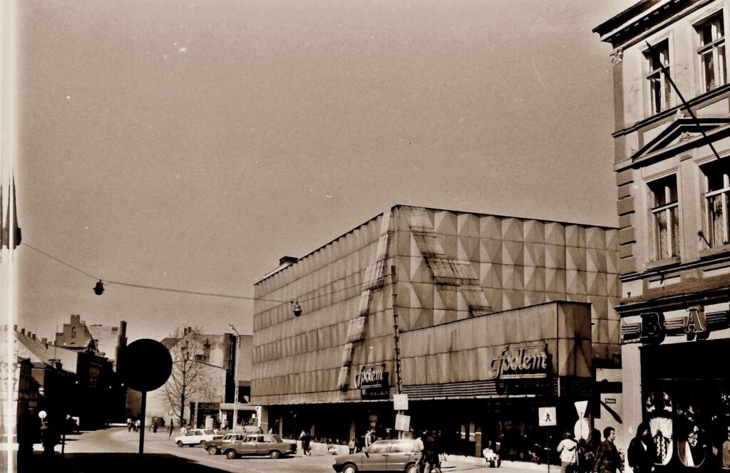 Jako się rzekło, dom handlowy powstał w pierwszej połowie lat 70. XX wieku w miejscu parterowych chałupek i kamienicy. Trzeba przyznać, że gmach – jak na socjalistyczną siermięgę – prezentował się nowocześnie. Głównie za sprawą elewacji wyłożoną blachą aluminiową, której fantazyjnie ułożone arkusze dawały ciekawą fakturę i którym „blaszak” zawdzięczał swoją obiegową nazwę.