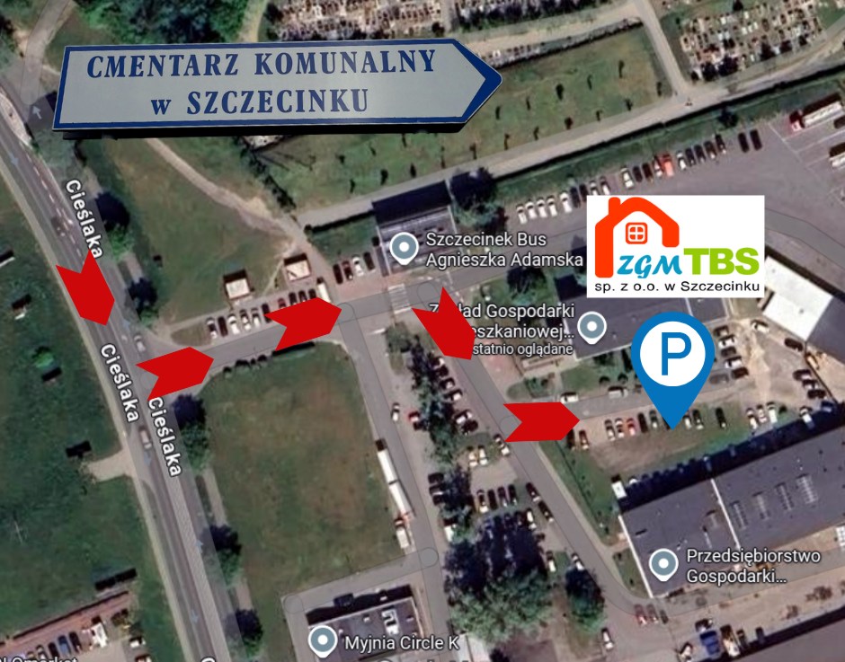 Zdajemy sobie sprawę, że nie wszyscy wybiorą takie rozwiązanie. Dlatego od piątku (31.10), od godziny 14 do niedzieli (2.11), do godziny 20 udostępniamy dodatkowe miejsca postojowe. Do Państwa dyspozycji będzie parking ZGM-TBS Szczecinek przy ulicy Cieślaka. Szczegóły dojazdu na poniższej grafice.