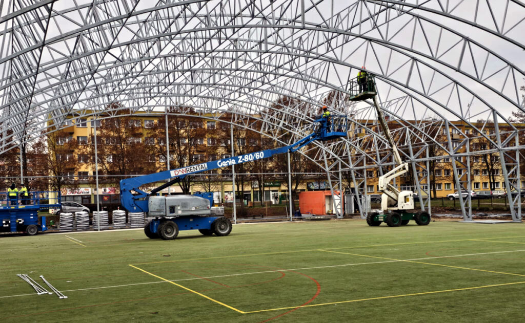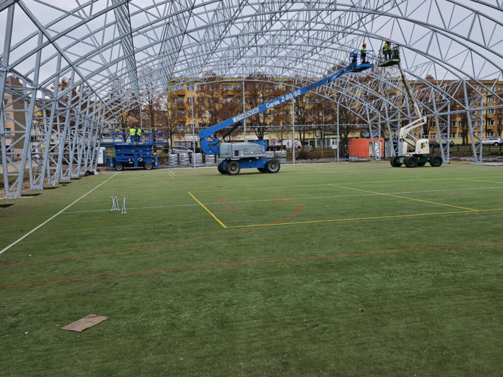 Wykonawca przeszedł już z etapu tworzenia szkieletu do instalowania zewnętrznej powłoki. To specjalna membrana, potocznie nazywana “balonem”, która osłoni obiekt i zapewni komfort trenowania niezależnie od pogody. Jak podkreślają inwestorzy, właśnie ten element sprawi, że boisko przy ZST będzie można użytkować przez cały rok.