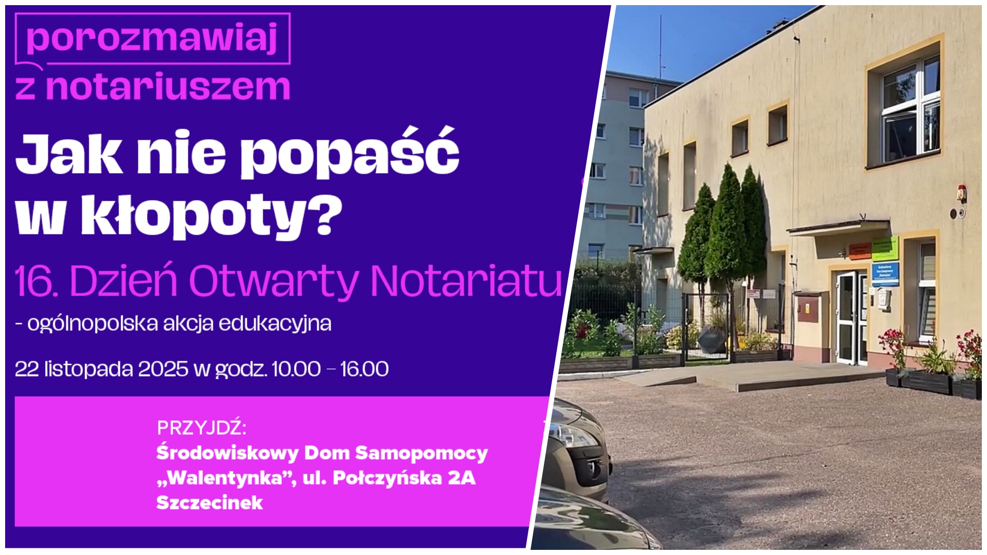 W Szczecinku z Dnia Otwartego Notariatu skorzystać będzie można w Środowiskowym Domu Samopomocy Walentynka, zlokalizowanym przy ul. Połczyńskiej 2A. Pozostałe szczegóły akcji, numery telefonów i lista miast: www.porozmawiajznotariuszem.pl.