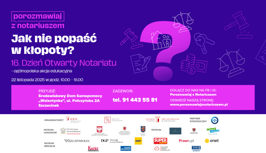 W sobotę 22 listopada 2025 r., w godzinach 10:00-16:00, notariusze w całej Polsce zapraszają na 16. edycję Dnia Otwartego Notariatu – ogólnopolskiej akcji edukacyjnej, podczas której każdy może uzyskać bezpłatną informację prawną u notariusza.