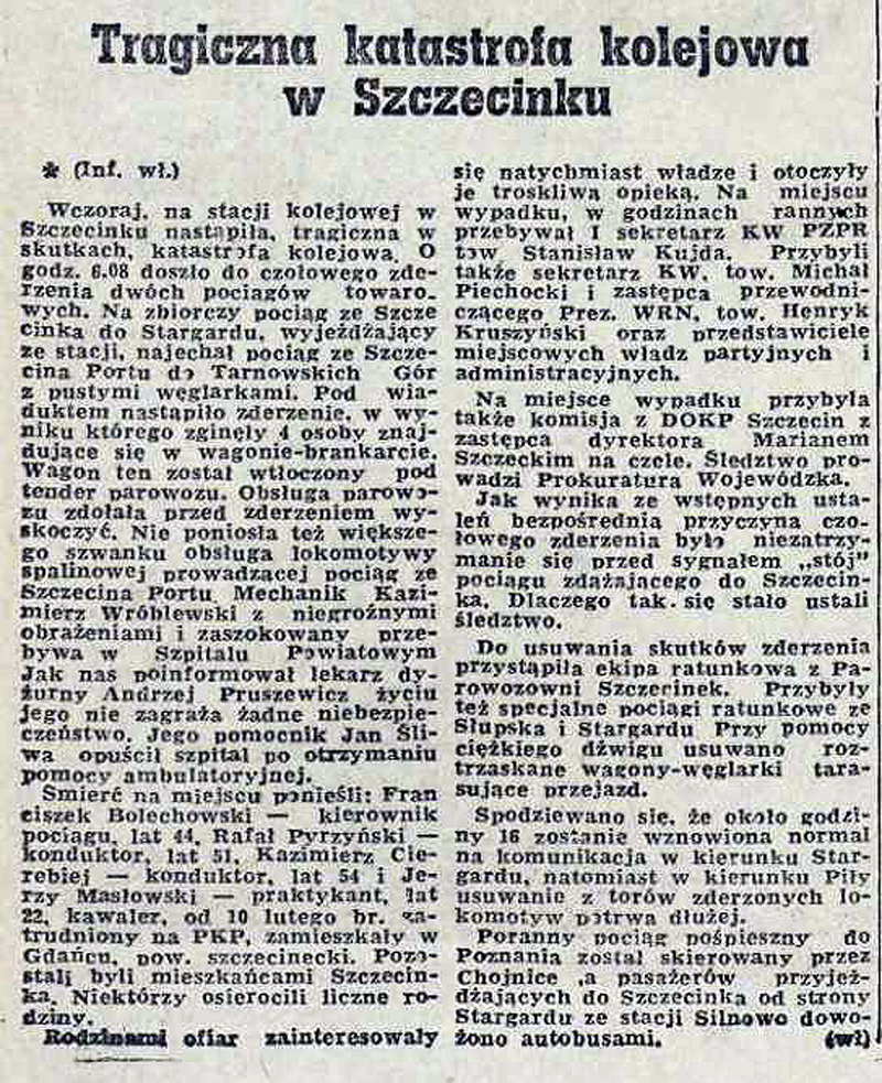 Wagon ten został wtłoczony pod tender parowozu. Obsługa parowozu zdołała przed zderzeniem wyskoczyć. Nie poniosła też większego szwanku obsługa lokomotywy spalinowej prowadzącej pociąg ze Szczecina Portu. (…). Na miejsc zginęli kierownik pociągu, dwóch konduktorów i praktykant”.