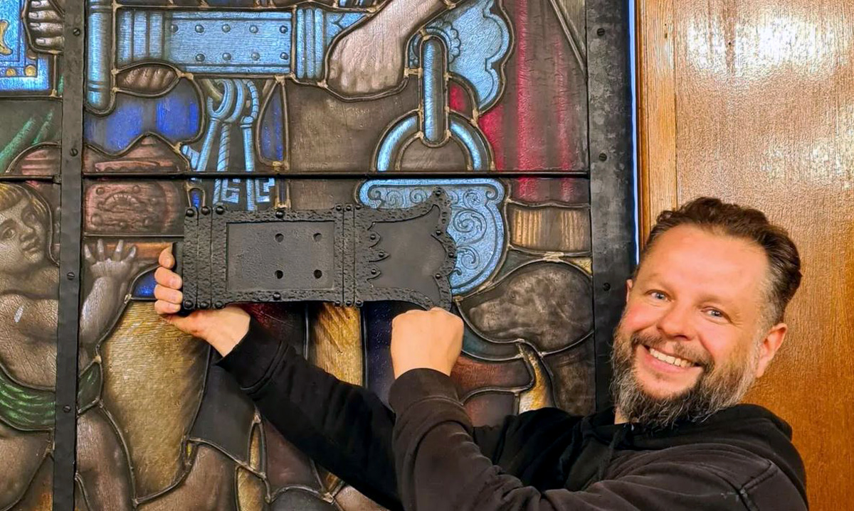 Montaż zawiasów wzorowanych na tych z witraży w szczecineckim ratuszu wieńczy wymianę magistrackich drzwi