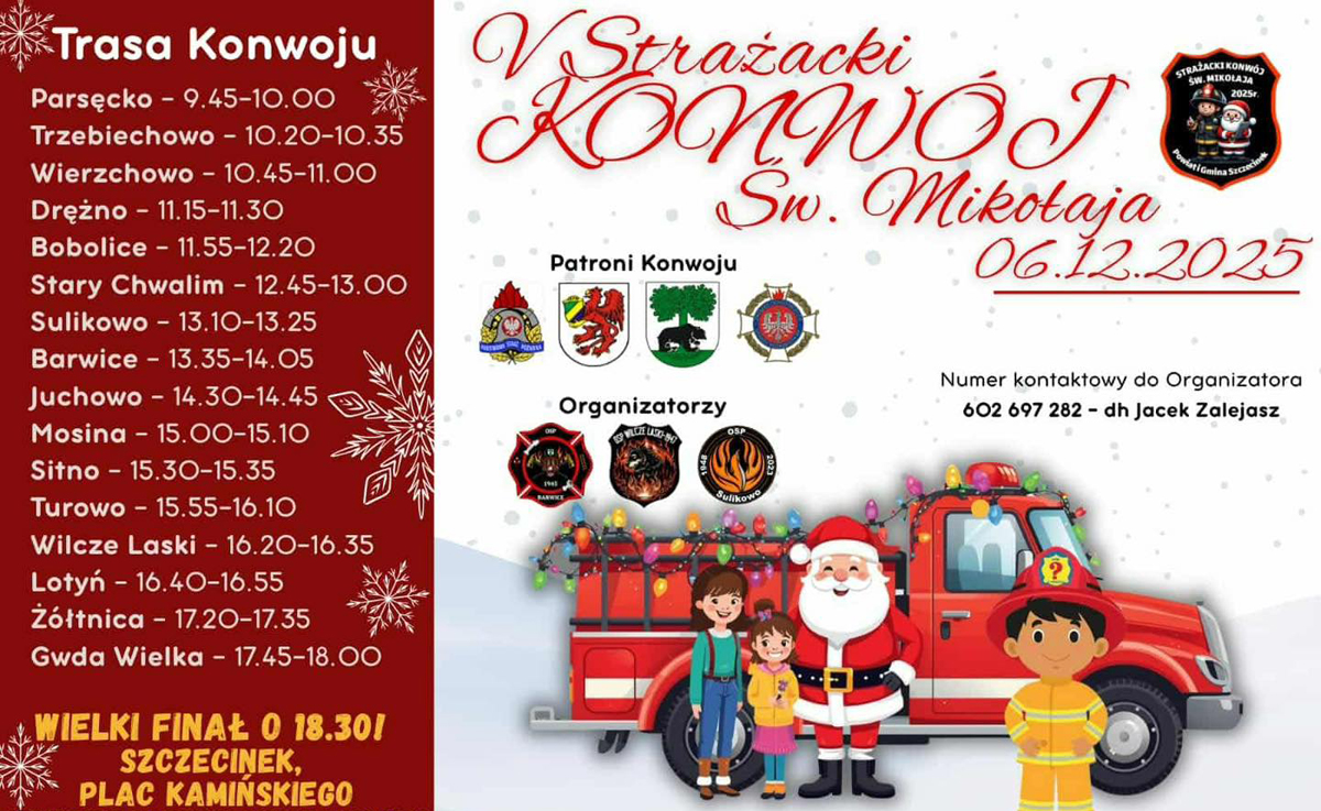 Finał Konwoju o godzinie 18:30 na placu Kamińskiego w Szczecinku, gdzie też od godz. 17 do 20 na wszystkich czekają animacje, atrakcje dla dzieci, muzyka, niespodzianki i oczywiście spotkanie z Mikołajem oraz strażakami.