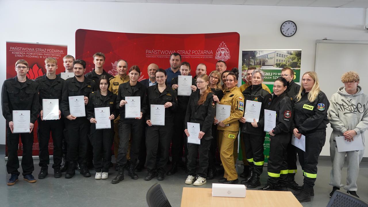 Dwudziestu uczniów klasy mundurowej o profilu strażackim w ZS nr 6 im. Stanisława Staszica w Szczecinku, którzy należą do jednostek OSP, a także dorośli druhowie Ochotniczych Straży Pożarnych, odebrało świadectwa ukończenia kursu podstawowego strażaka ochotnika OSP. Certyfikaty wręczyli starosta Krzysztof Lis oraz komendant powiatowy PSP st. kpt. Mirosław Śledź. To nie tylko formalność – to realne uprawnienia, odpowiedzialność i gotowość do działania.