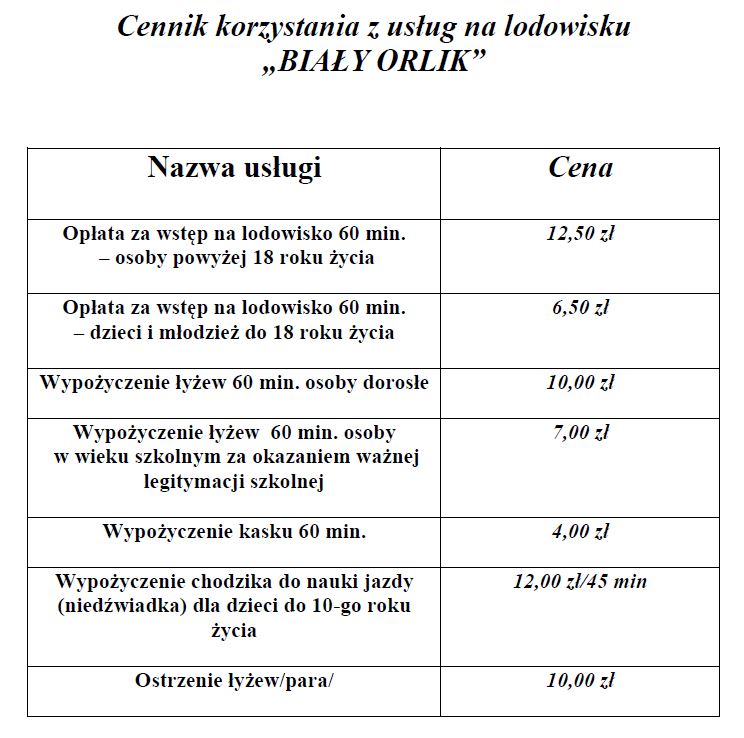 Odpłatność za korzystanie z lodowiska, wypożyczenie sprzętu, chodzika do nauki jazdy oraz ostrzenie łyżew pozostała na poziomie minionego sezonu. Szczegóły płatności za poszczególne usługi poniżej: