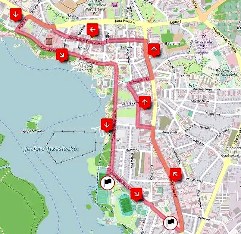 Trasa biegu poprowadzi najpierw ulicami Piłsudskiego i księcia Warcisława IV. Następnie, na zmodyfikowanym odcinku, biegacze skręcą w ulicę Kamińskiego i pobiegną dalej ulicami Limanowskiego oraz Rzemieślniczą, by następnie wrócić na ulicę Wyszyńskiego. Dalsza część trasy pozostaje bez zmian – zawodnicy pobiegną deptakiem Bartoszewskiego, przez plac Wolności i ulicą Bohaterów Warszawy aż do ulicy Kościuszki. Następnie skręcą w Jasną, pobiegną ulicami Ordona, 3 Maja i Mickiewicza, by ostatecznie dotrzeć na stadion miejski.