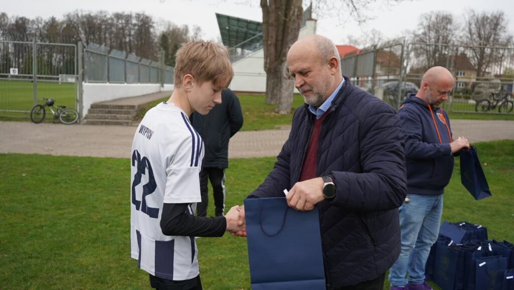 Nowe komplety trafiły do zawodników w wyjątkowych okolicznościach. Podczas jednego z popołudniowych treningów pojawił się starosta Krzysztof Lis, który osobiście wręczył młodym piłkarzom stroje.