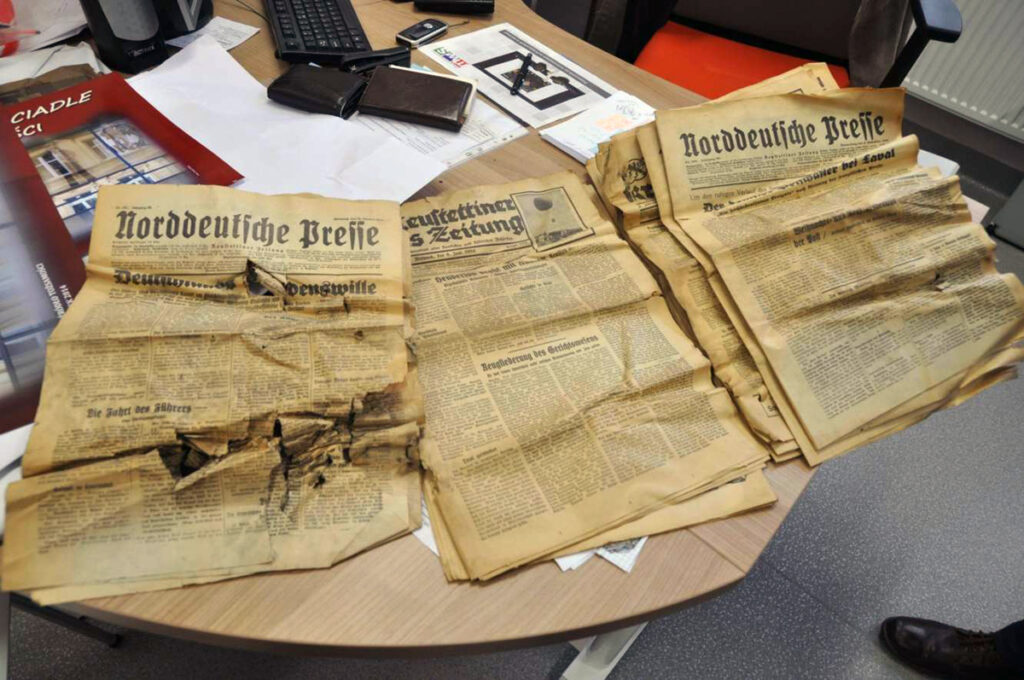 Trafiały się jednak i mniej trwałe pamiątki przeszłości. W roku 2014, przy okazji remontu poddasza w szczecineckim ratuszu, znaleziono niemieckie gazety. Były za ościeżnicą w tym przejściu, około 20 lokalnych gazet Neustettiner Kreis Zeitung (Szczecinecka Gazeta Powiatowa) oraz Norddeutsche Presse (Prasa Północnoniemiecka) z lat 1933-34. Najstarszą część urzędu wzniesiono w połowie XIX wieku, więc to raczej pozostałość późniejszych remontów. Papier gazetowy był wtedy powszechnie używany, jako materiał izolacyjny przy uszczelnianiu framug okien i drzwi.