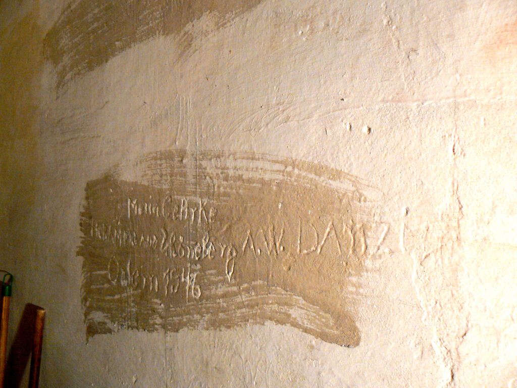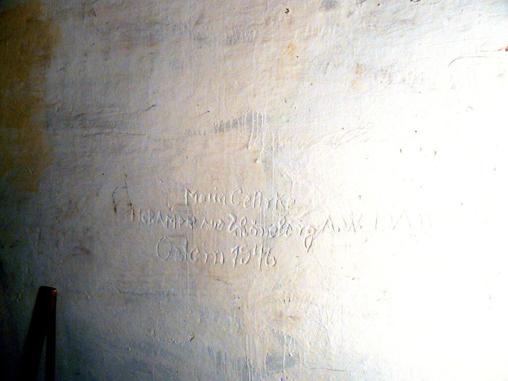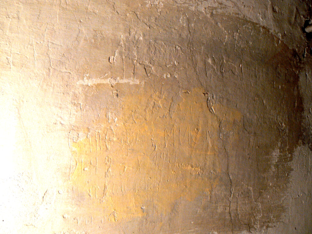 Napisy zostały odpowiednio zabezpieczone. Przetrzymywane tu osoby uwieczniły na murze swoje imiona i daty uwięzienia. Napisy z roku 1944 są w języku rosyjskim, te z 1946 po niemiecku. Można powiedzieć, że wraz z końcem wojny zmienili się lokatorzy więzienia.