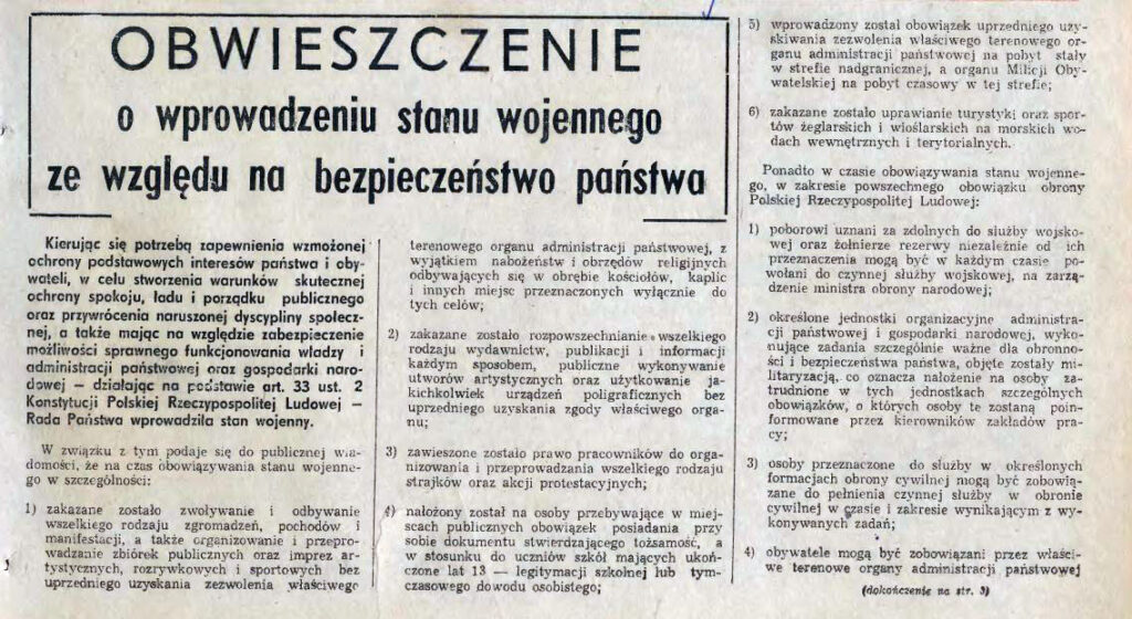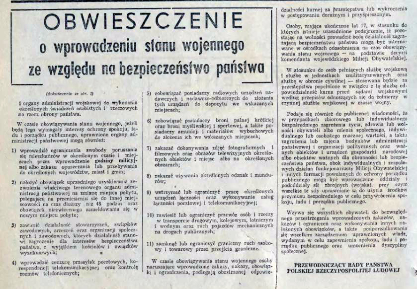 Stan wojenny w Polsce wprowadzono 13 grudnia 1981 roku na terenie Polskiej Rzeczypospolitej Ludowej, trwał do końca roku następnego, choć formalnie zniesiono go dopiero 22 lipca 1983 roku. Była to odpowiedź władz komunistycznych Wojciecha Jaruzelskiego na rosnącą w siłę Solidarność. Organizatorzy zamachu wojskowego tłumaczyli to groźbą interwencji sowieckiej i destabilizacją życia w kraju. De facto była to obrona władzy komunistów i starego systemu. Wojsko, milicja i Służba Bezpieczeństwa internowały ponad 10 tysięcy działaczy Solidarności, Szacuje się, że w wyniku stanu wojennego zginęło około 40 osób, w tym 9 górników z kopalń „Wujek”, w której ZOMO zaatakowało strajkujących górników. Zdławienie opozycji skutkowało zapaścią gospodarczą i setkami tysięcy emigrantów politycznych i ekonomicznych, którzy wyjechali wkrótce z Polski. Nikt za autorów stanu wojennego nie odpowiedział za jego wprowadzenie. W roku 2012 skazano jedynie PRL-owskiego ministra spraw wewnętrznych Czesława Kiszczaka, ale do więzienia i tak nie trafił, bo wykonanie kary warunkowo zawieszono. Wkrótce potem zresztą zmarł. Sąd w uzasadnieniu wyroku stwierdził, że grupa najwyższych dowódców Ludowego Wojska Polskiego weszła w tajne porozumienie, które stanowiło związek przestępczy o charakterze zbrojnym. Jego uczestnicy mieli pełną świadomość, że wprowadzenie stanu wojennego z wykorzystaniem uprawnień Rady Państwa do wydawania dekretów z mocą ustawy w czasie trwającej sesji sejmu będzie nielegalne.