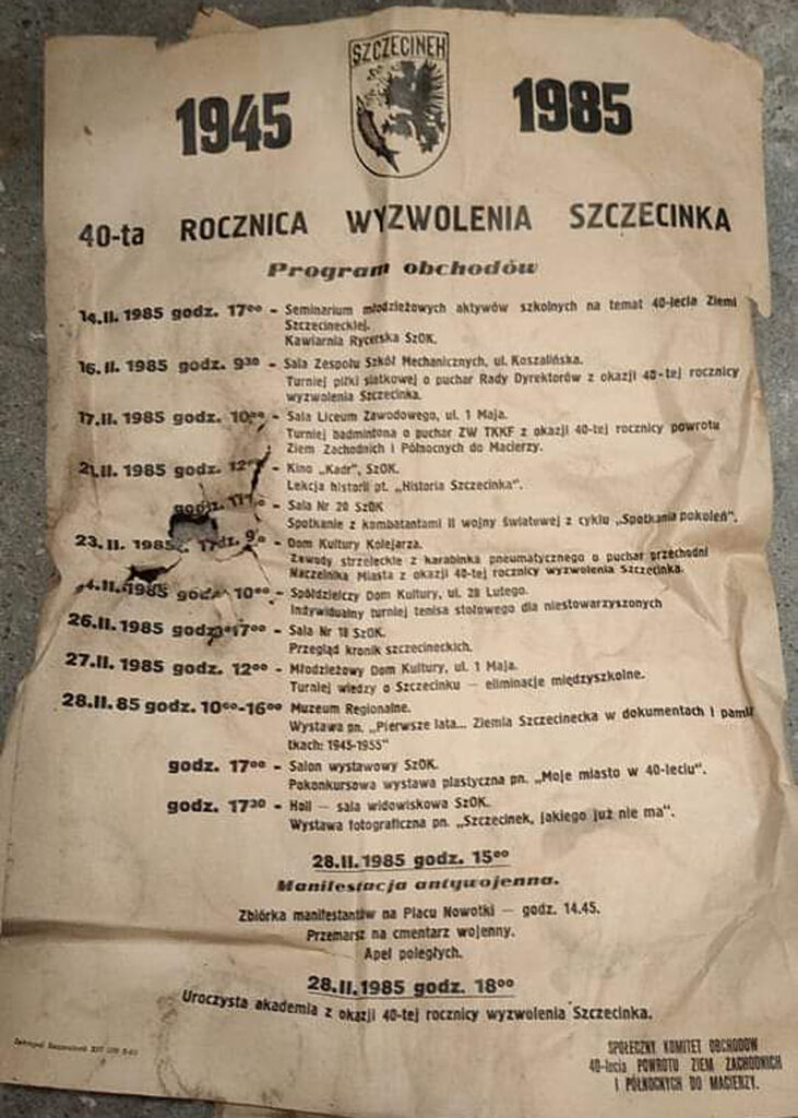 Jak dawniej obchodzono rocznicę wyzwolenia Szczecinka? Uroczyście, jak np. w 1985 roku. Z resztek zachowanego do dziś plakatu możemy się dowiedzieć, że doniosłe obchody rozpoczęły się już 14 lutego seminarium młodzieżowych aktywów szkolnych. Impreza odbyła się w Kawiarni Rycerskiej Szczecineckiego Ośrodka Kultury.