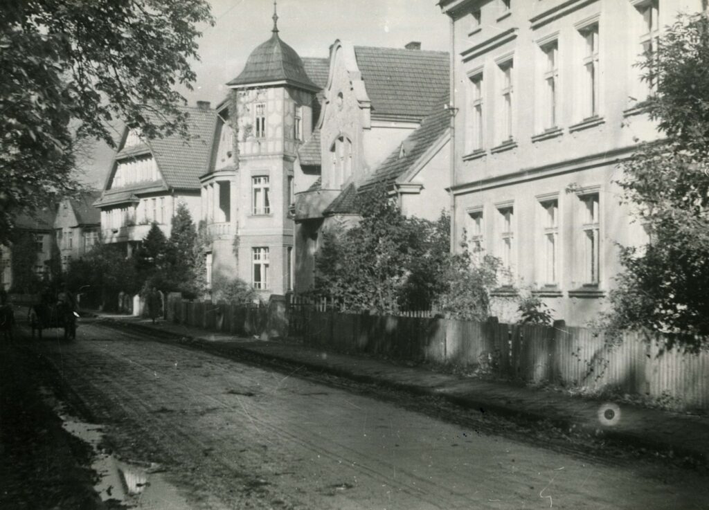 Na fotografiach można zobaczyć między innymi ówczesną ulicę 9 Maja, wyłożoną jeszcze granitową kostką brukową. To interesujące ujęcie prowadzące wzrok w stronę placu Wolności.