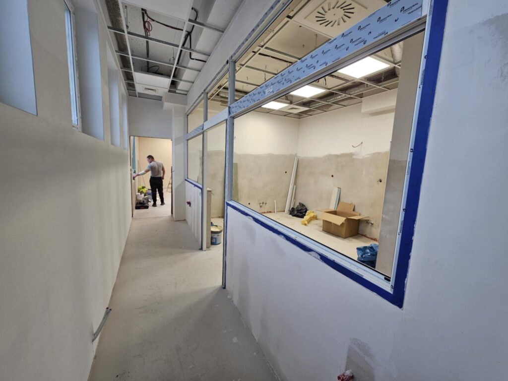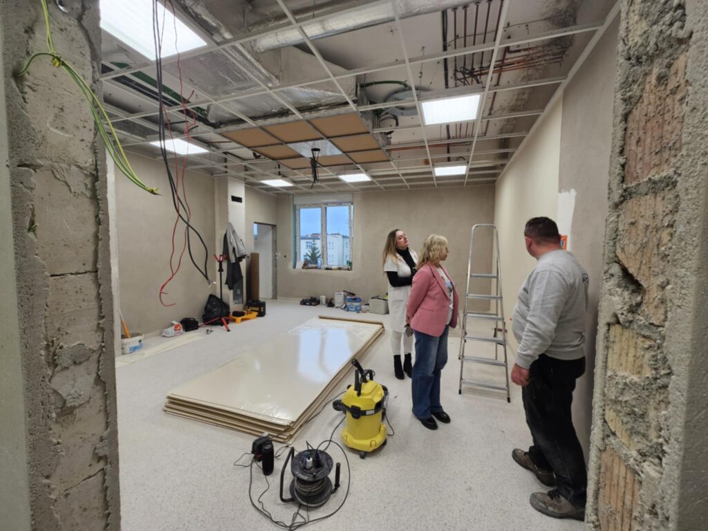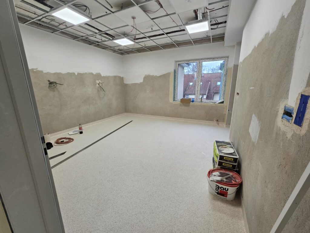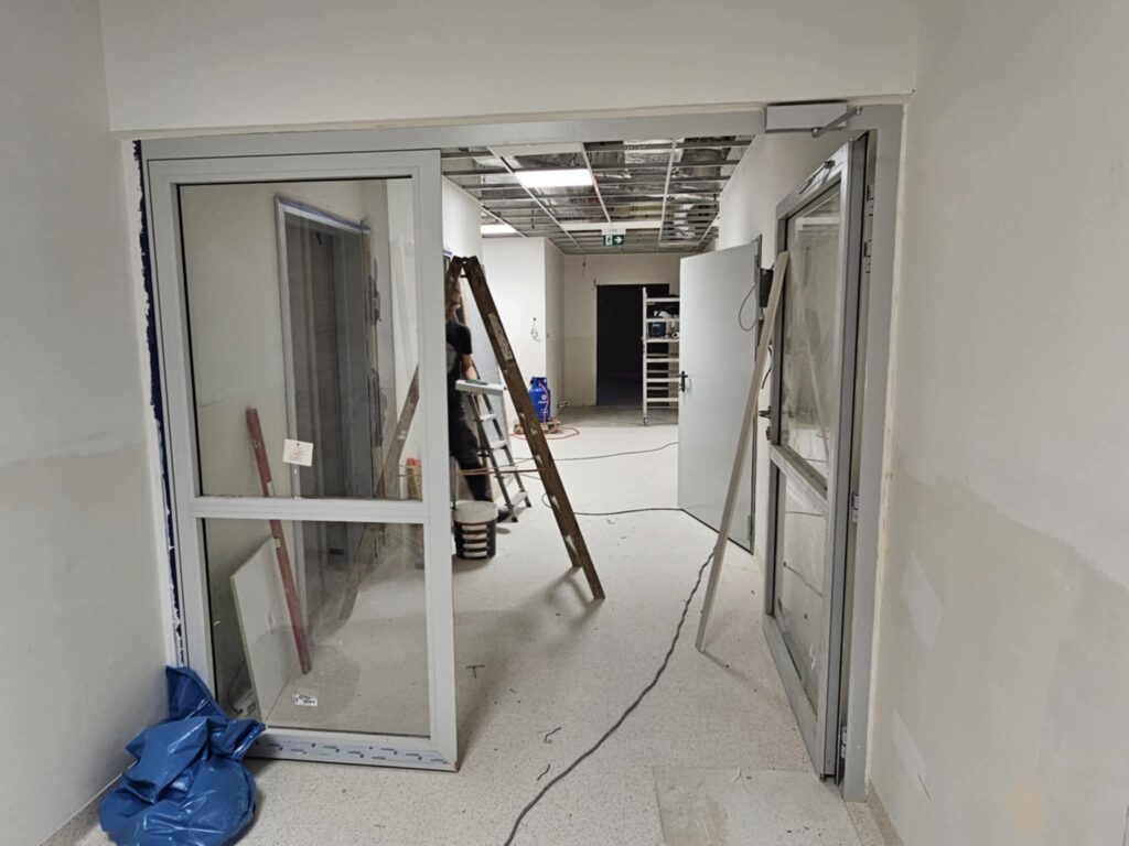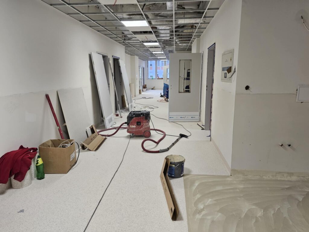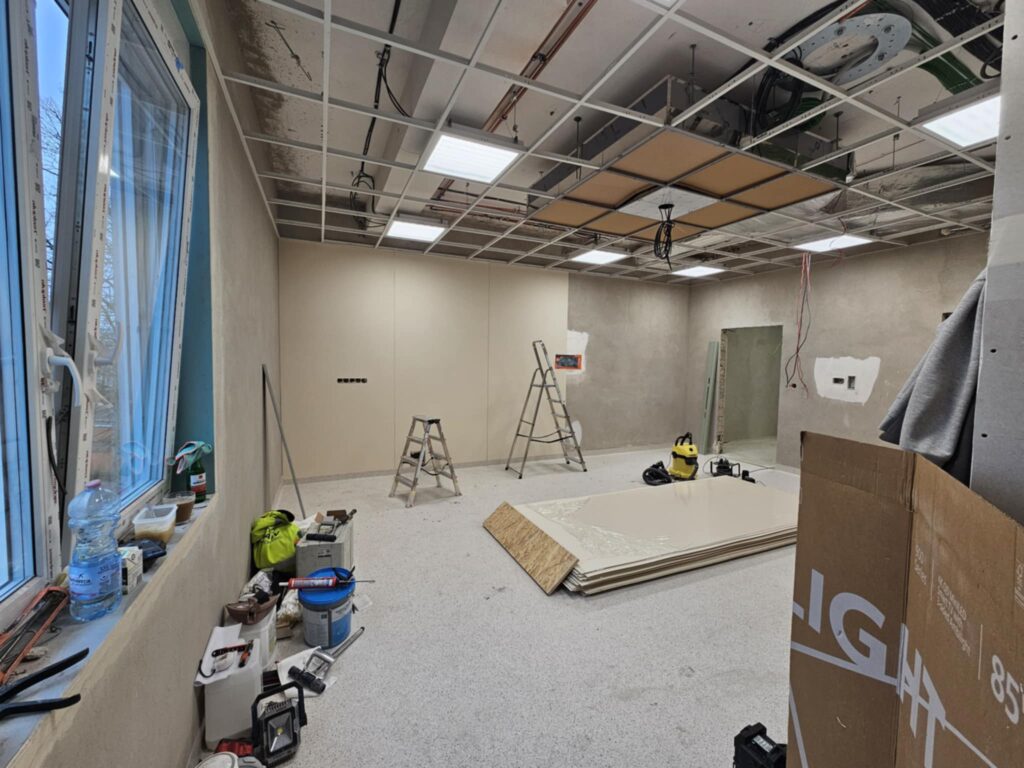 Gruntowna przebudowa objęła całą przestrzeń bloku – od sal operacyjnych, przez strefy przygotowawcze, po zaplecze dla personelu. Zdemontowano stare ściany działowe, sufit podwieszany oraz posadzki, dzięki czemu możliwe było poprowadzenie nowych instalacji: elektrycznej, wentylacyjnej, sanitarnej i systemu gazów medycznych. W wielu pomieszczeniach widać już ułożone podkłady, trwają też intensywne prace przy wylewaniu posadzek oraz montażu wykładzin o właściwościach antypoślizgowych i antybakteryjnych. Ekipy budowlane przygotowują ściany pod wykończenie, montują elementy stolarki i zabezpieczenia techniczne.