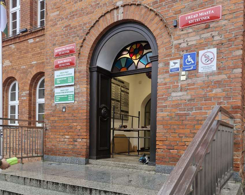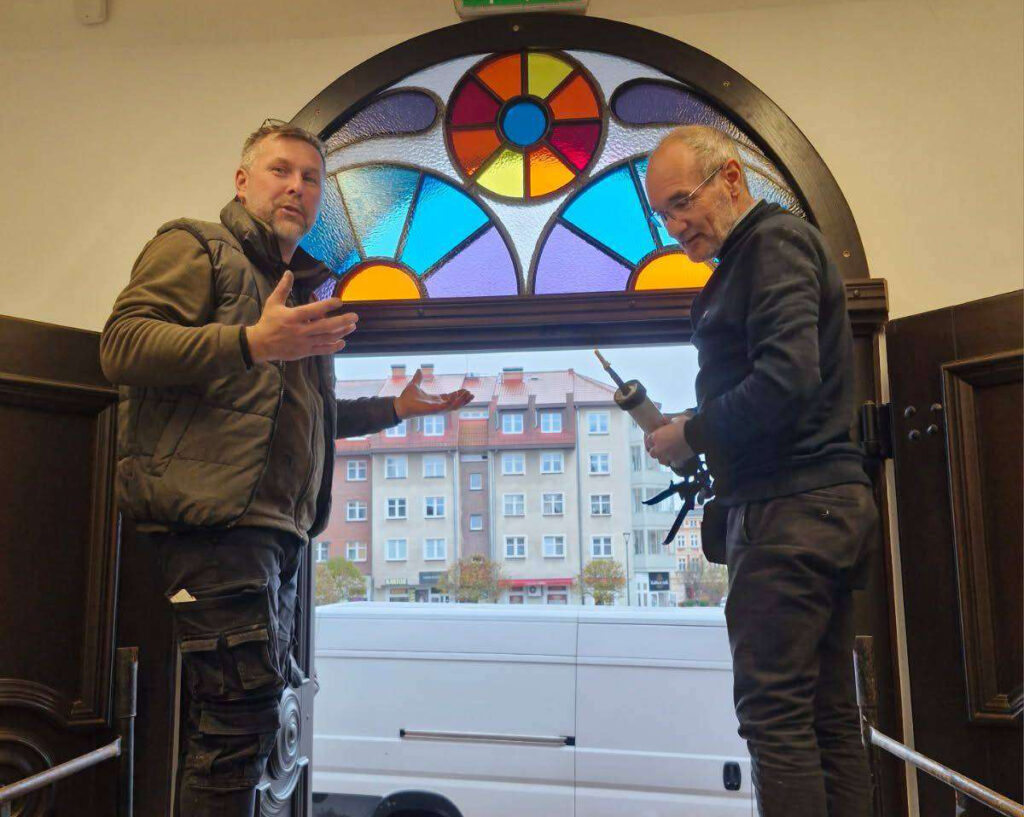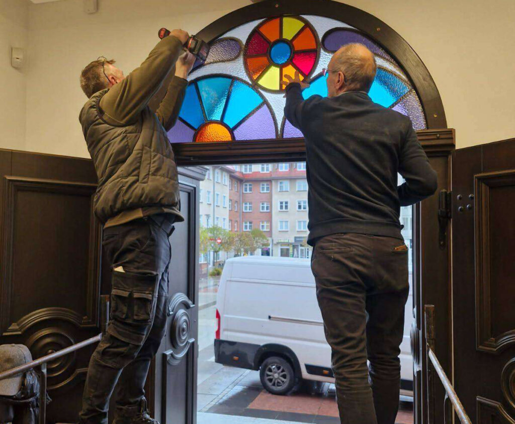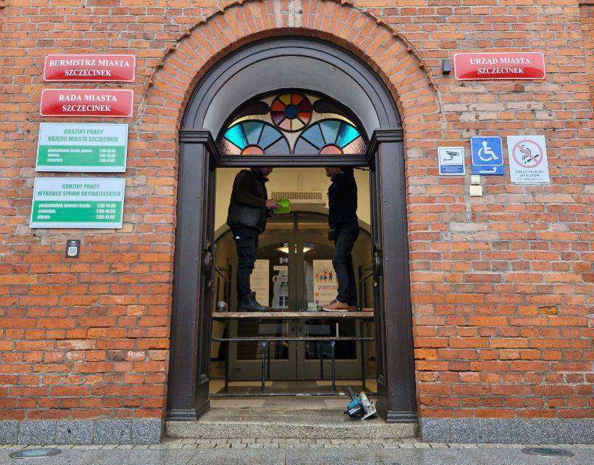 Wymiana drzwi do szczecineckiego magistratu została ukończona – portal drzwiowy ma już kolorowy witraż.