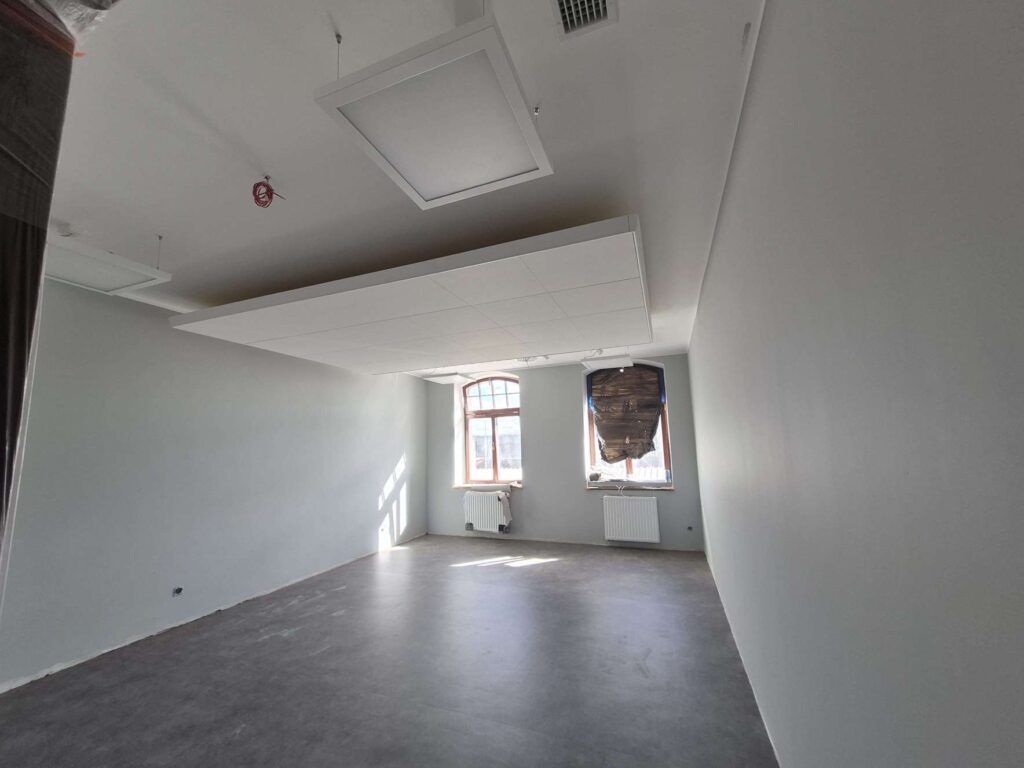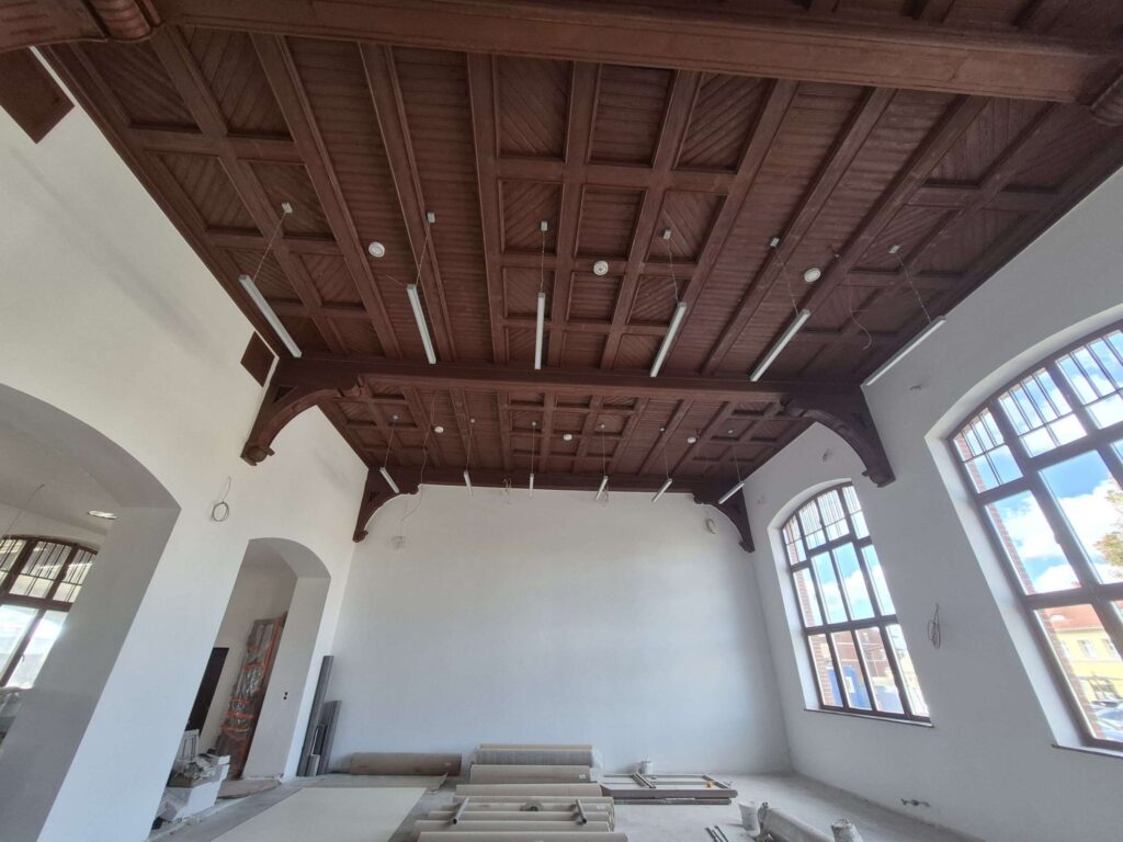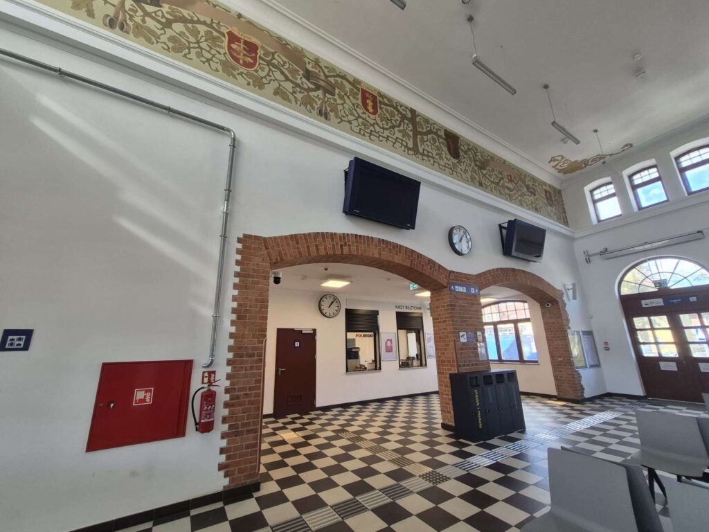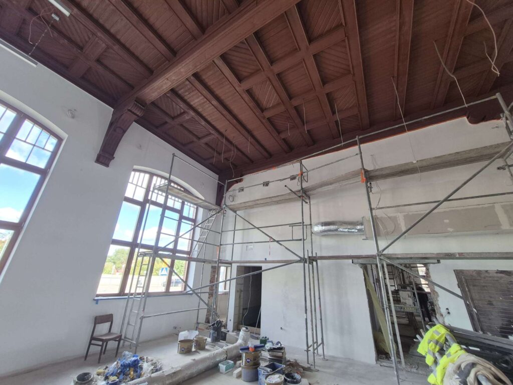 Zakończono większość prac instalatorskich, na montaż czekają windy. Sporo dzieje się też w dawnej poczekalni, która teraz będzie salą taneczną. Oraz w sąsiedniej sali wielofunkcyjnej – dawnej dworcowej restauracji. To tu odkryto piękne, drewniane sklepienie i polichromie (orły) sprzed ponad 100 lat. Zostały one zakonserwowane i będą tzw. świadkiem historii.