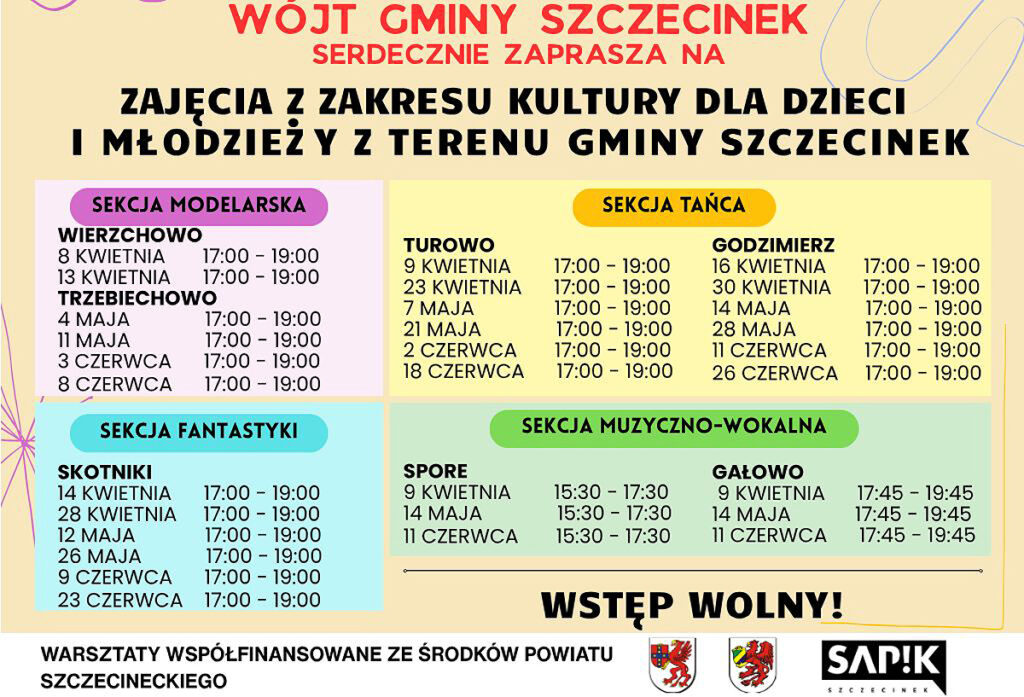 W ramach zajęć przygotowano kilka różnorodnych sekcji, dzięki czemu każdy młody uczestnik może znaleźć coś dla siebie. Zajęcia modelarskie opuszczają Wierzchowo i odbywać się będą w Trzebiechowie (4 i 11 maja, 3 i 8 czerwca) w godzinach 17:00–19:00. Miłośnicy tańca mogą skorzystać z warsztatów w Turowie (23 kwietnia, 7 i 21 maja, 2 i 18 czerwca) oraz w Godzimierzu (30 kwietnia, 14 i 28 maja, 11 i 26 czerwca), również w godzinach 17:00–19:00.
