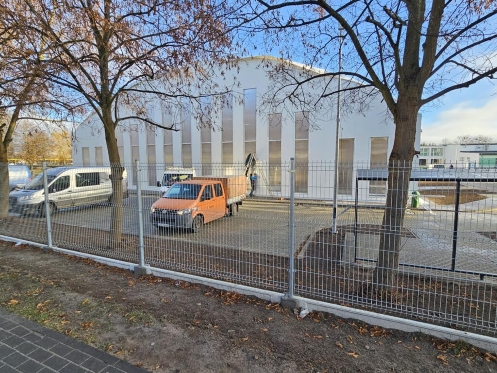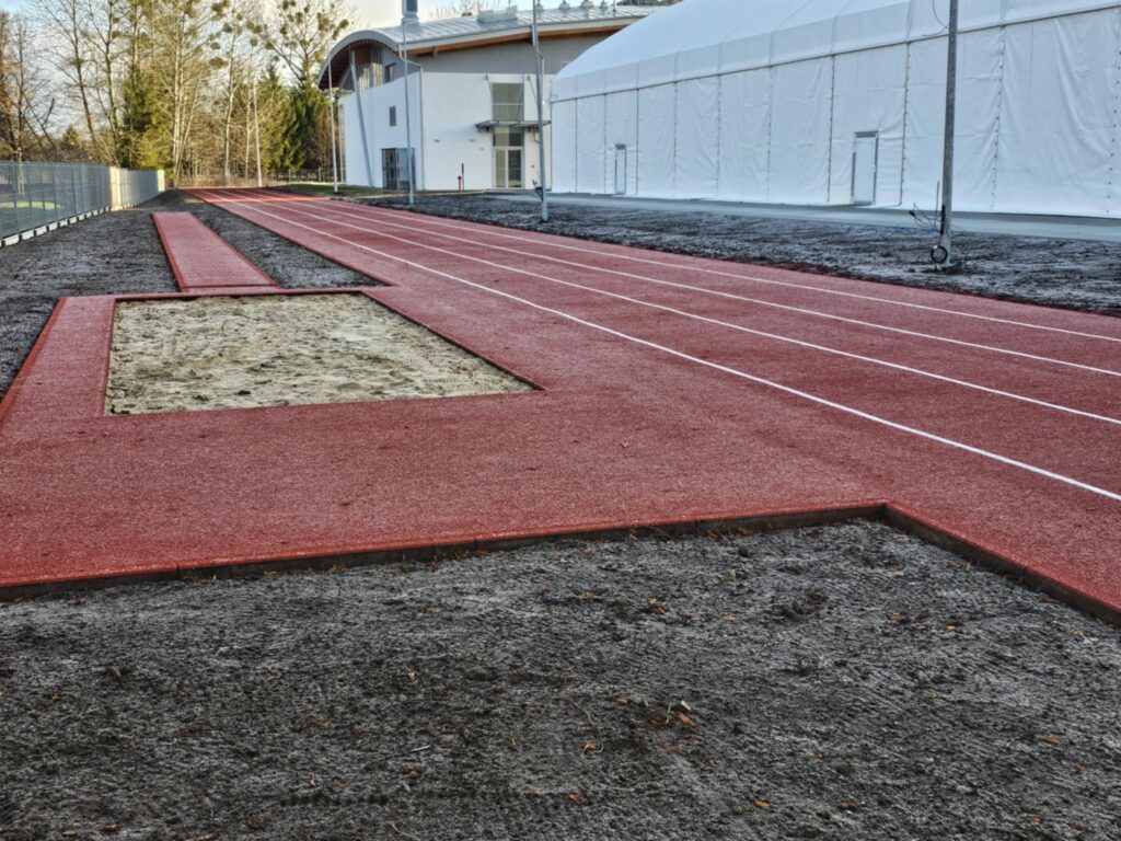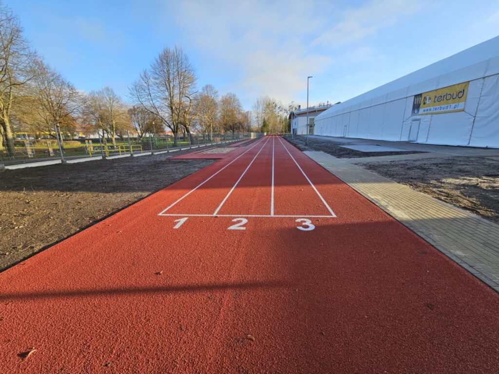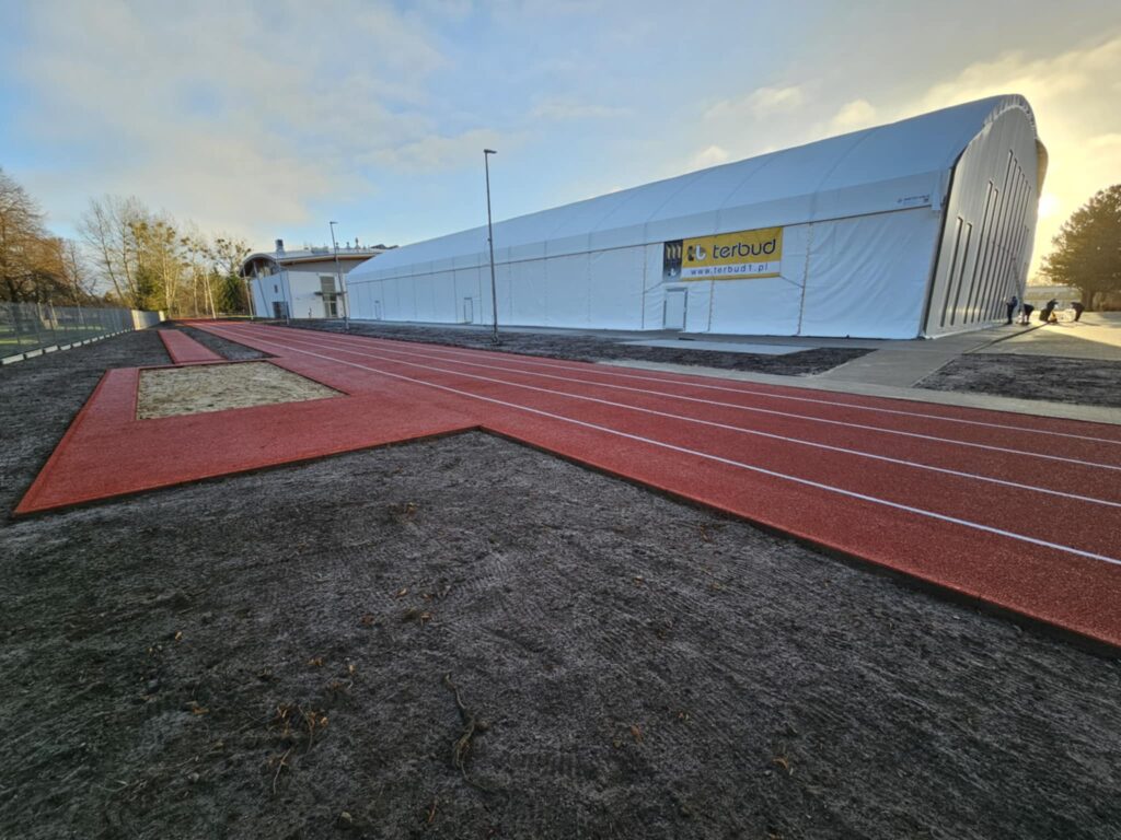 Dużą zmianę widać także wokół „namiotu”. Zakończono budowę trzytorowej bieżni lekkoatletycznej na dystansie 100 metrów, która od razu przyciąga wzrok intensywną, czerwoną nawierzchnią i wyraźnym oznaczeniem torów. Tuż obok powstało stanowisko do skoku w dal z profesjonalnym zeskokiem, gotowe do prowadzenia zajęć lekkoatletycznych. Ten fragment inwestycji jest już w pełni ukończony i wyraźnie podnosi sportowy potencjał całego kompleksu.