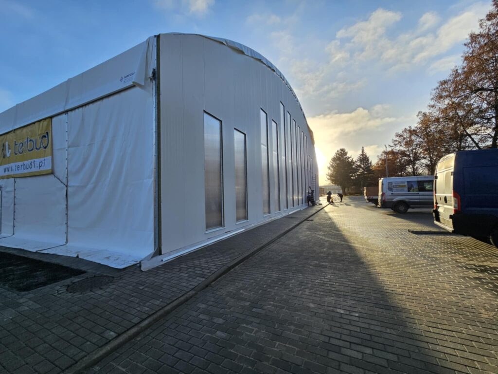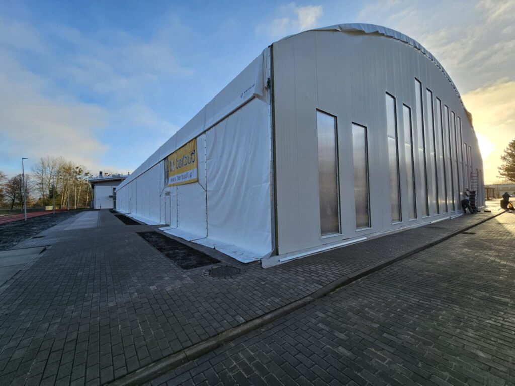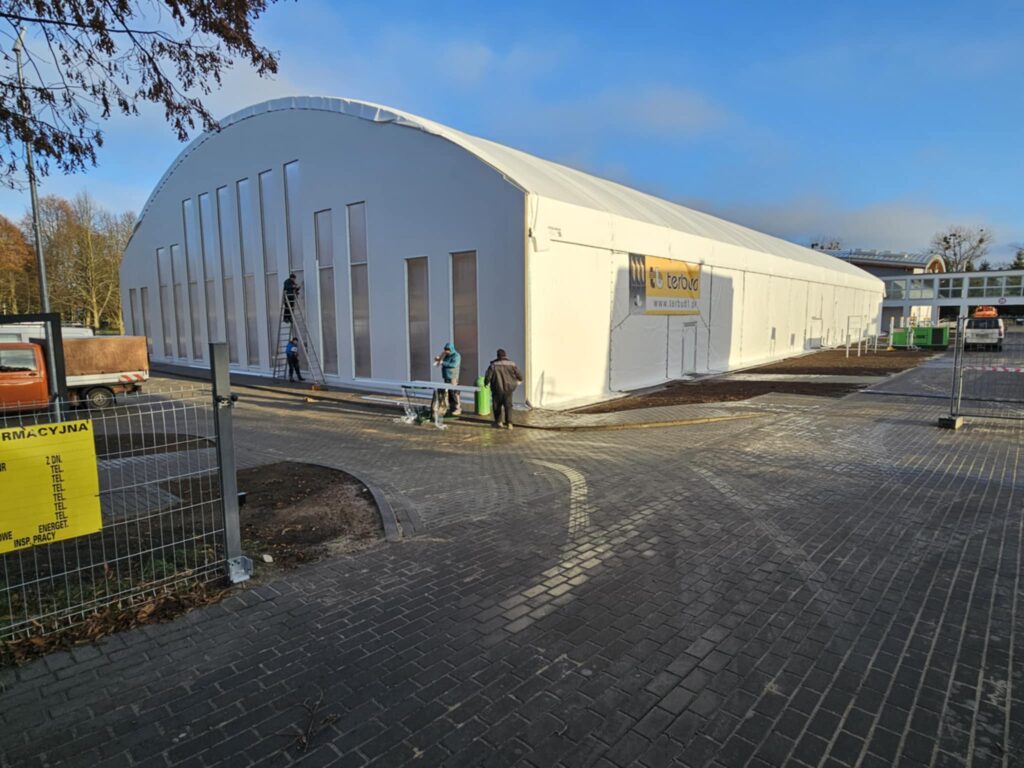 Budowa zadaszenia boiska przy Zespół Szkół Technicznych w Szczecinku jest na finiszu. Membranowe poszycie zostało w całości zamontowane, konstrukcja jest zamknięta, a na terenie inwestycji trwają już głównie prace kosmetyczne i porządkowe. Obiekt coraz wyraźniej pokazuje, jak będzie wyglądać gotowa, całoroczna arena sportowa.