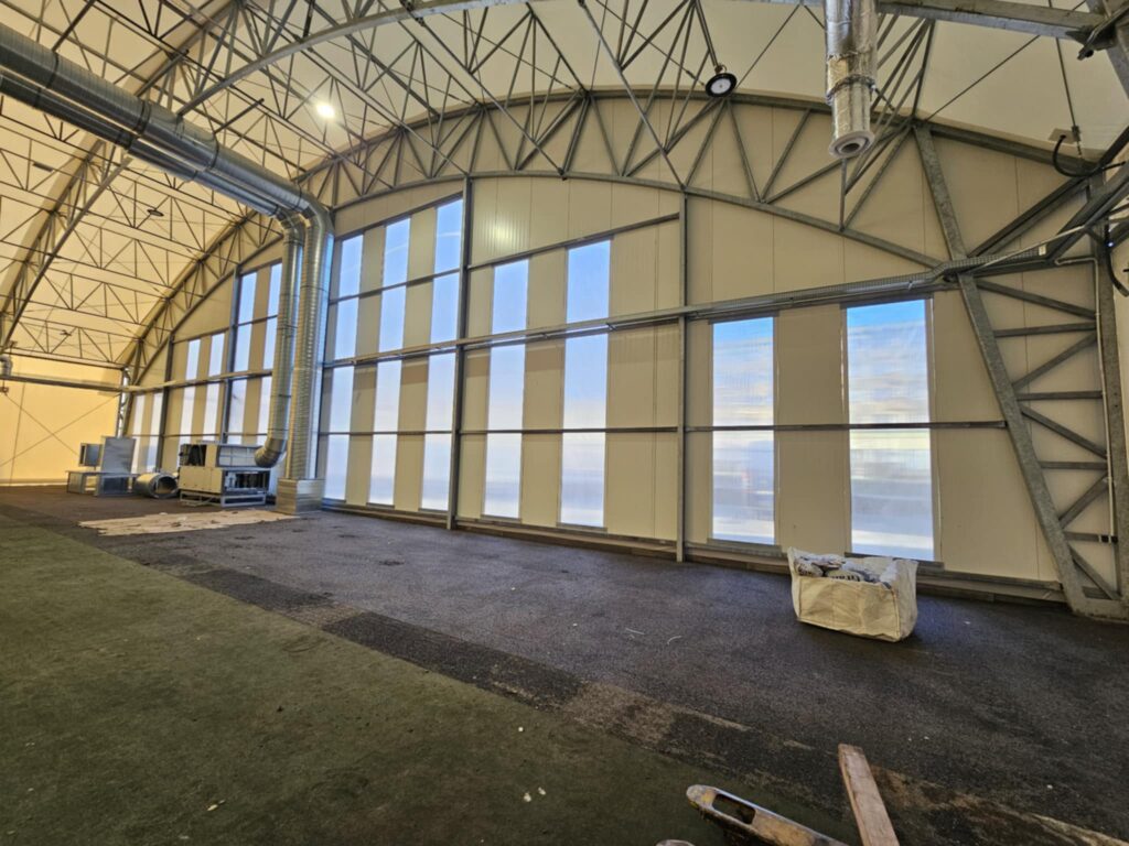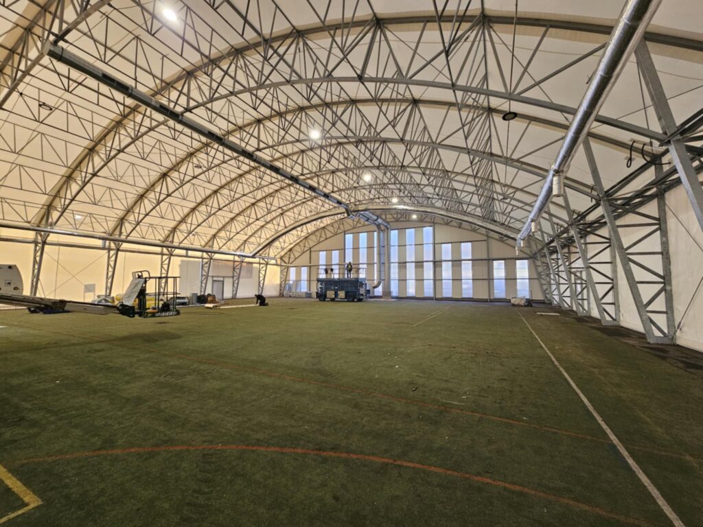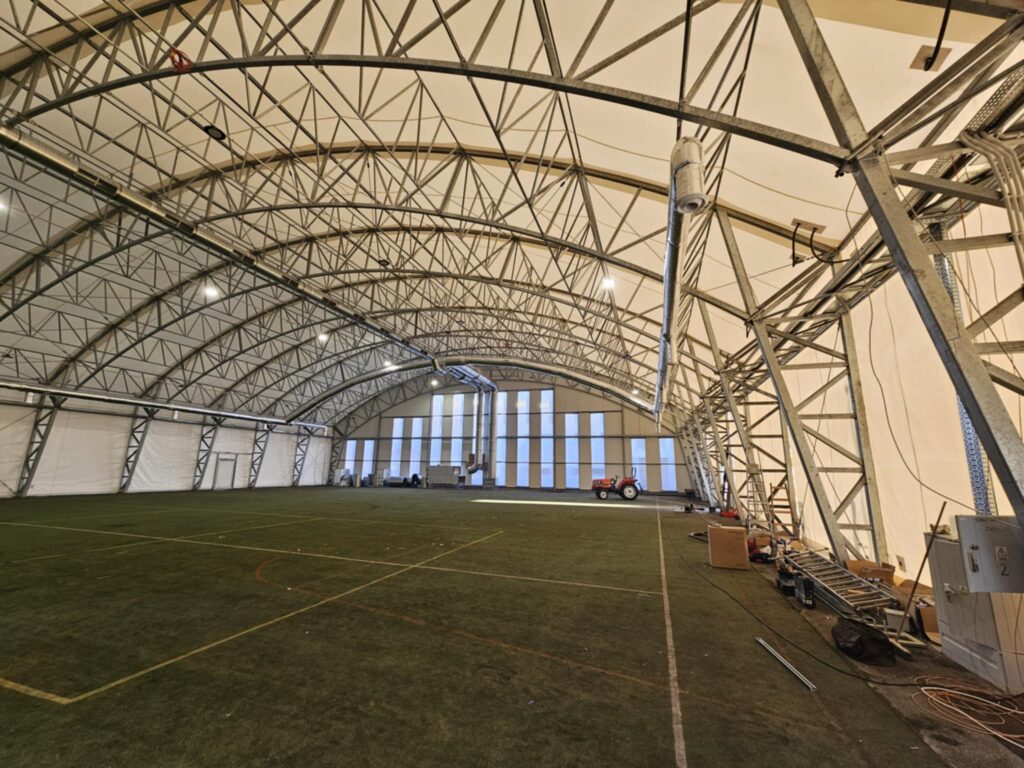 Równie imponująco wygląda wnętrze. Pod ogromnym, łukowym dachem rozciąga się pełnowymiarowa przestrzeń sportowa, a stalowa konstrukcja nośna i instalacje techniczne są już w całości zamontowane. Obiekt jest zamknięty i przygotowany do dalszych etapów wyposażania oraz prac związanych z nawierzchnią boiska.
