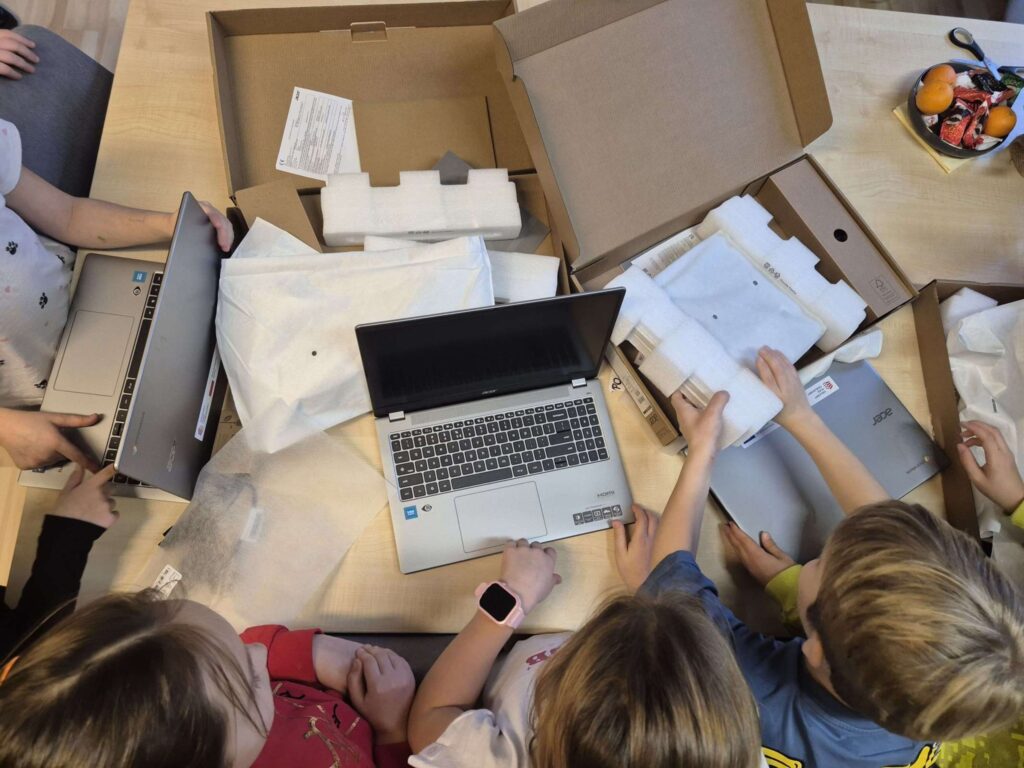 Laptopy przeglądarkowe – sprzęt do nauki zdalnej – są już w szkołach podstawowych Szczecinka – na zdjęciu uczniowie z „szóstki” z nowymi komputerami. Wkrótce kolejne dostawy wyposażenia pracowni sztucznej inteligencji. Otrzymują je SP1, SP4, SP6 i SP7. W skład jednego zestawu wchodzi 16 laptopów, jednostka centralna usług AI, urządzenie sieciowe AP z Wi-Fi, szafka na urządzenia z funkcją ładowania laptopów, zasilanie gwarantowane UPS dla jednostki centralnej, monitor interaktywny o przekątnej ekranu minimum 75 cali ze stojakiem, kamera HD USB wraz z mikrofonem oraz statywem oraz oprogramowanie.
