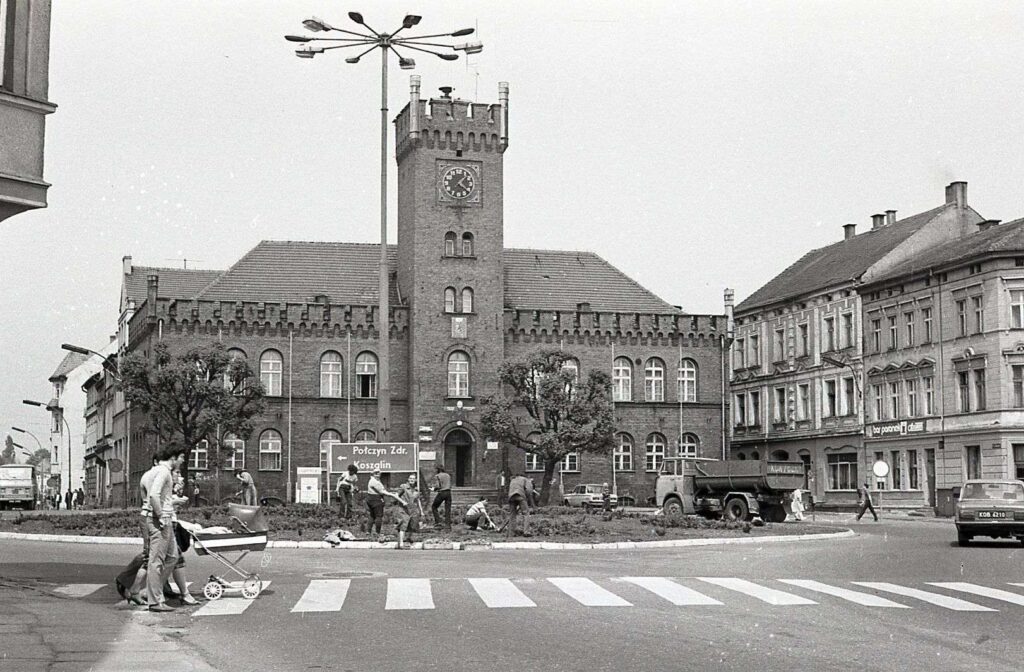 Co jeszcze widzimy? Hotel robotniczy Komunalnego Przedsiębiorstwa Budownictwa Specjalnego przy ulicy Wodociągowej (dziś są tu m.in. mieszkania, noclegownia i Środowiskowy Dom Samopomocy Walentynka). Obrazki z centrum Szczecinka – z ulicy Kościuszki przy kamienicy, gdzie znajdowało się obserwatorium Adama Giedrysa, czy plac Wolności (już po zburzeniu Zakładów Przemysłu Terenowego – dziś stoją tu bloki) z ratuszem w latach 80..