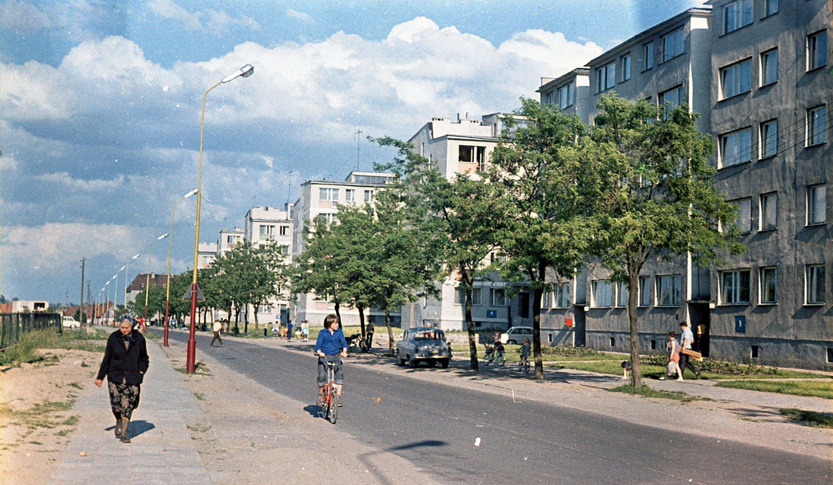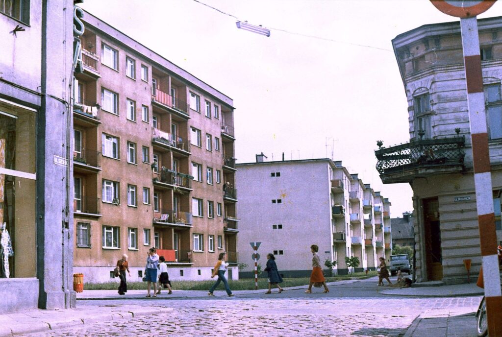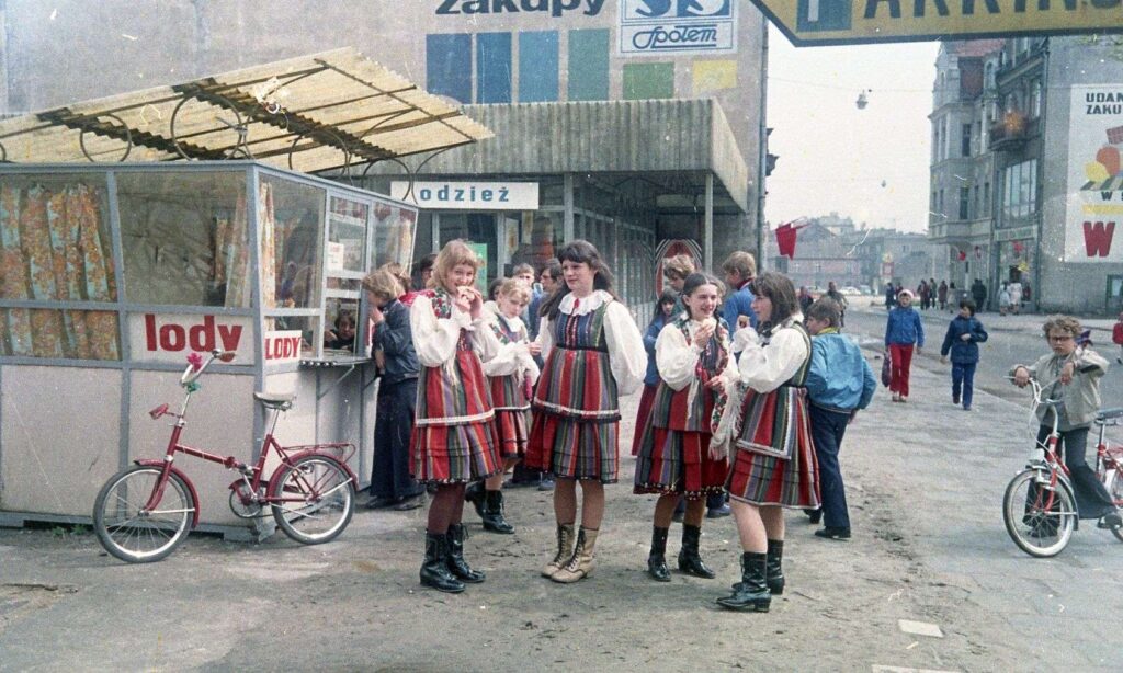 Szczególnej uwadze polecamy jednak emblematyczne zdjęcie grupki młodych ludzi z strojach ludowych zajadającymi się lodami z budki przy ulicy Bohaterów Warszawy. W tle widzimy plac Wolności i parterowy pawilon handlowy, a samą ulicą – dziś deptakiem – jeżdżą samochody. Kolorowa plama w szarym mieście. Zdjęcie datujemy na początek lat 70., a widzimy na nim zapewne członków zespołu ludowego Łany 66 działającego w szkole rolniczej.