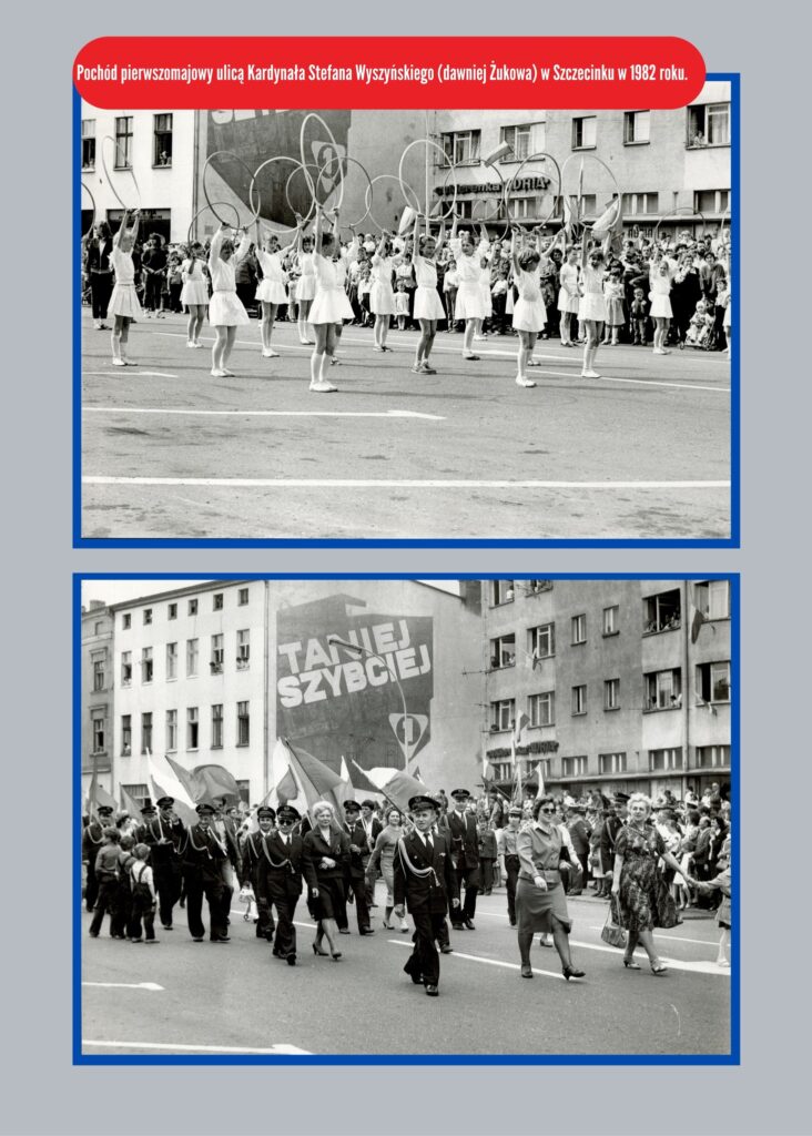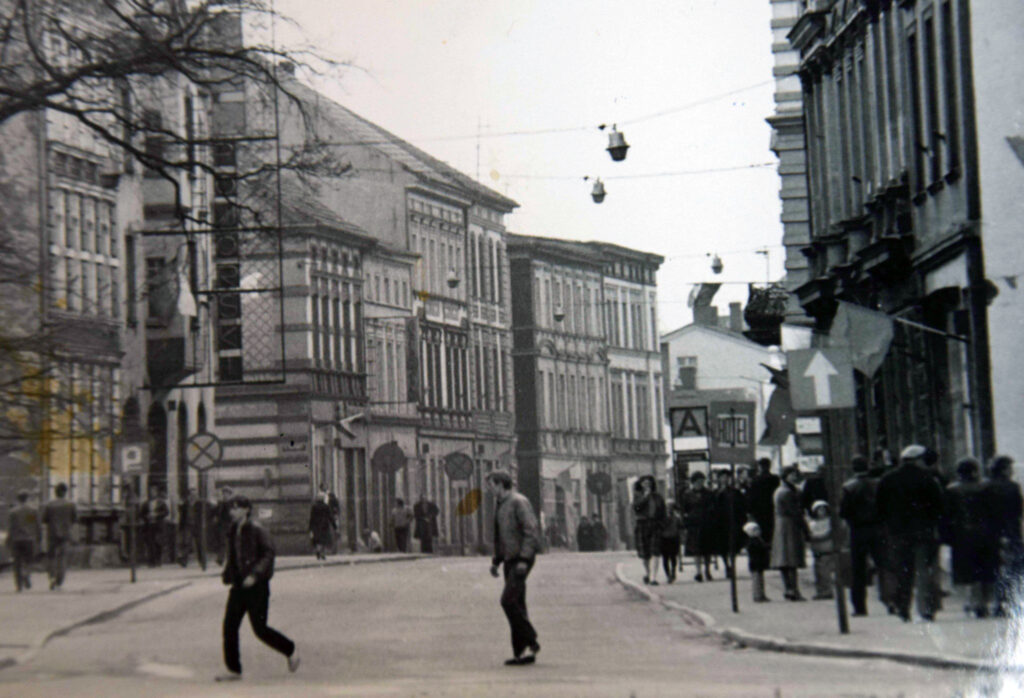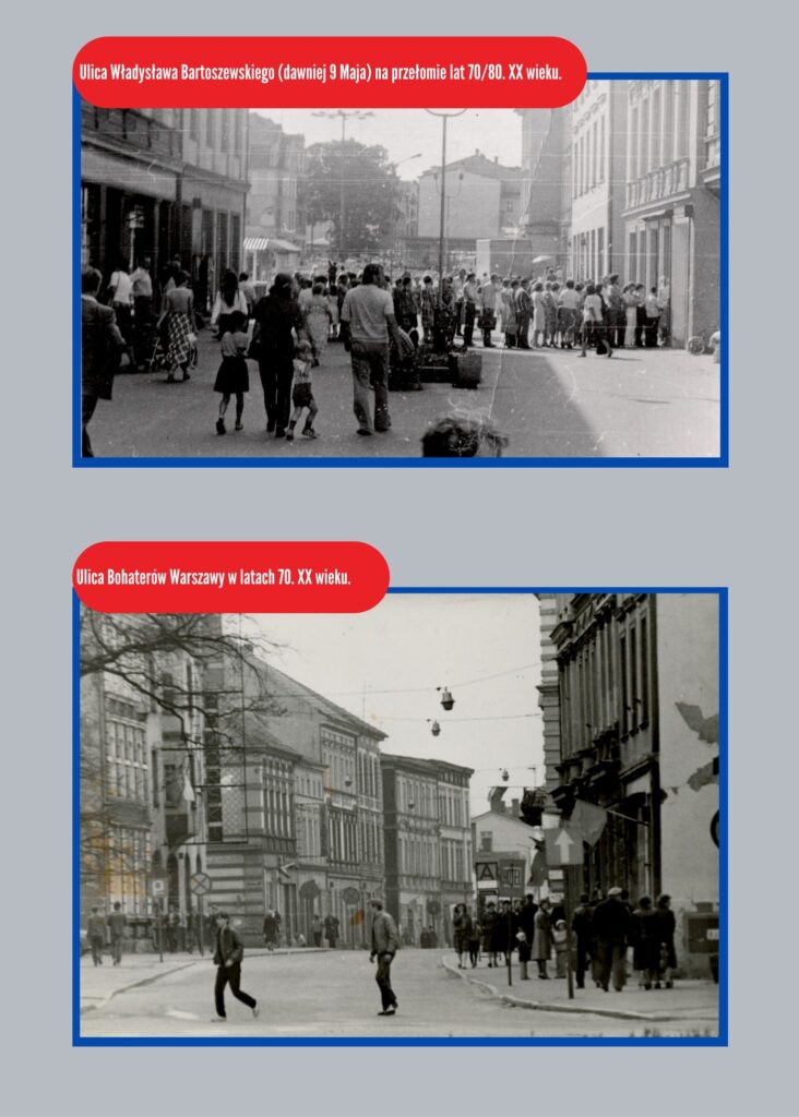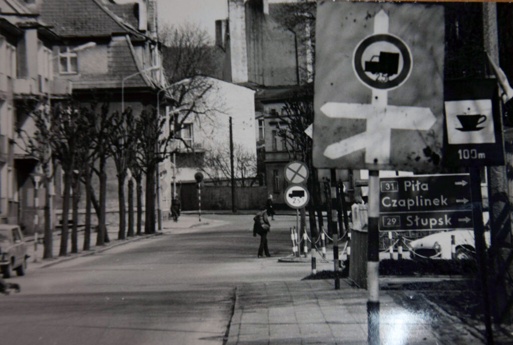 Przenosimy się na ulicę Bohaterów Warszawy, która akurat w III RP nazwy nie zmieniła. Zmieniła natomiast charakter, bo w latach 80. była to zwykła ulica, pełna samochodów. W pieszy deptak przemianowano ją dopiero w latach 90. wieku. Działał wówczas jeszcze hotel Pomorski z restauracją, a nad ulica rozpięte były przewody z lampami – to jeden z bardziej charakterystycznych obrazków ówczesnego Szczecinka. Uwagę zwraca również oczywiście minimalny ruch samochodowy.