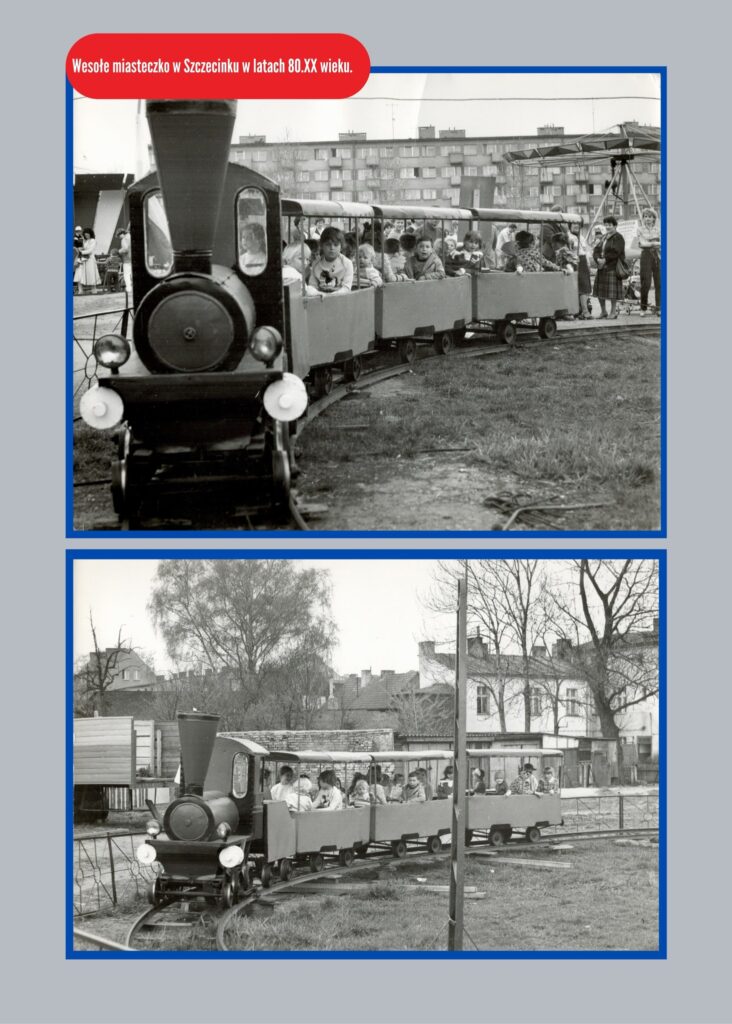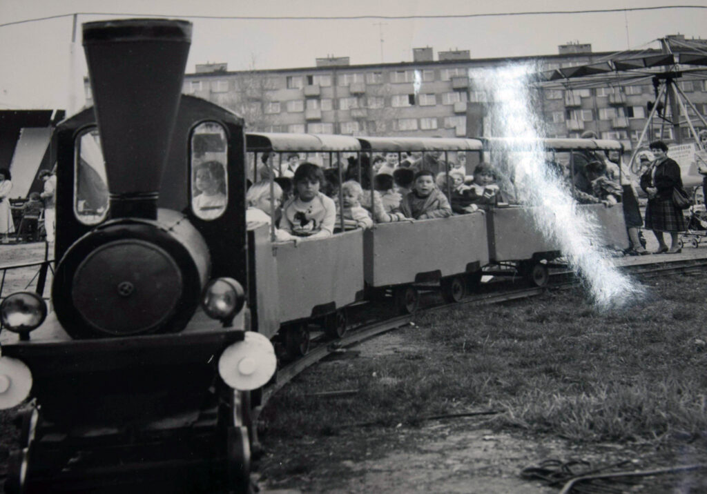 Przedszkolaki siedzą także w wagonikach zabawkowej kolejki w wesołym miasteczku, które rozbiło się na placu Winnicznym obok pozostałości browaru przy ówczesnej ulicy Żukowa (dziś Wyszyńskiego).