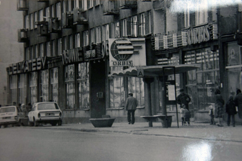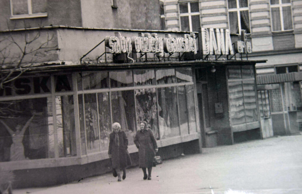 Deptakiem od końcówki lat 70. była z kolei ulica 9 Maja (dziś Bartoszewskiego) – i tu pan Król wykonał zdjęcie, na którym widzimy salon odzieżowy Dana na wysokości skrzyżowania z ulicą Mariacką. Warto zwrócić na szczegół w tle. Otóż przy wejściu do sklepu wisi automat telefoniczny. W Polsce Ludowej telefon w domu był dobrem deficytowym, więc możliwość zadzwonienia z budki telefonicznej (lub od sąsiada) była ratunkiem. Jeszcze w 2000 roku funkcjonowało w Polsce ponad 95 tysięcy publicznych aparatów, ostatnie zniknęły dobrą dekadę temu.