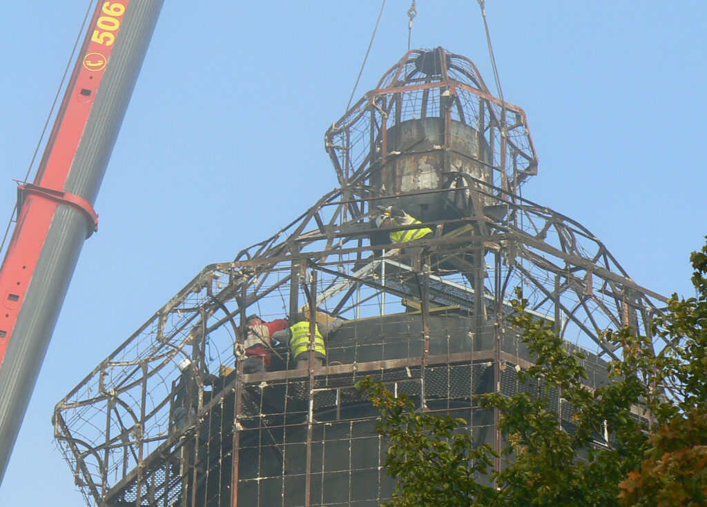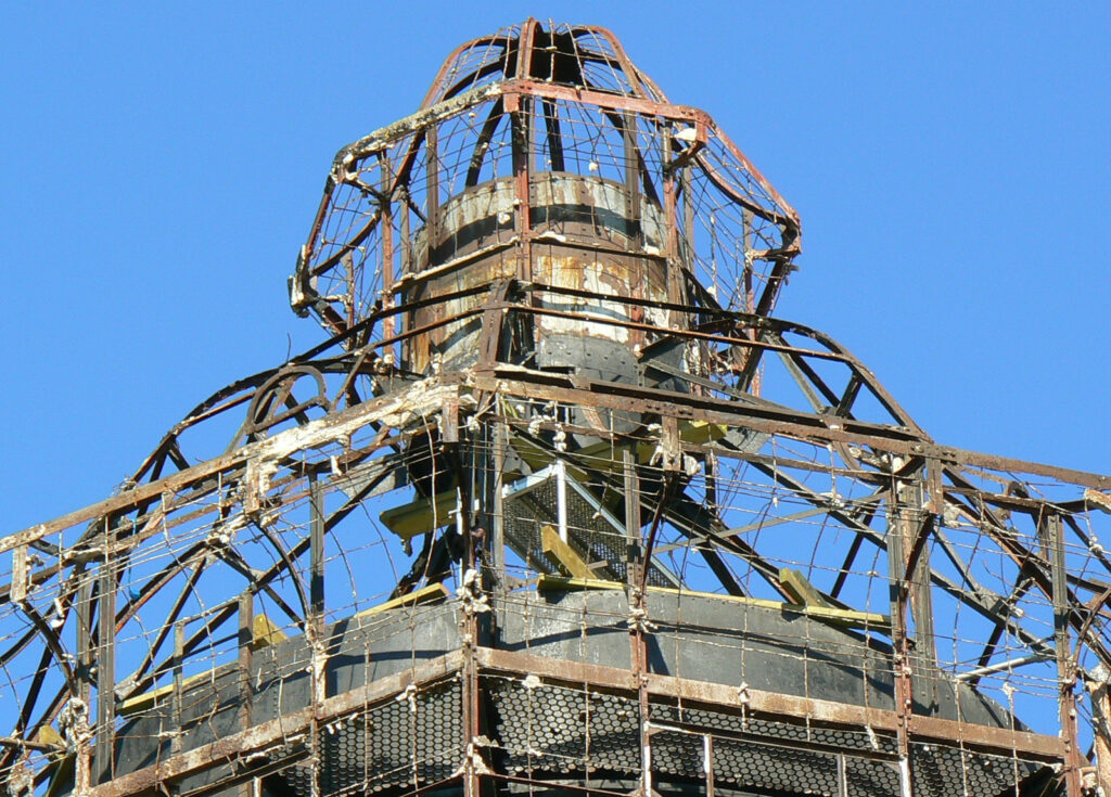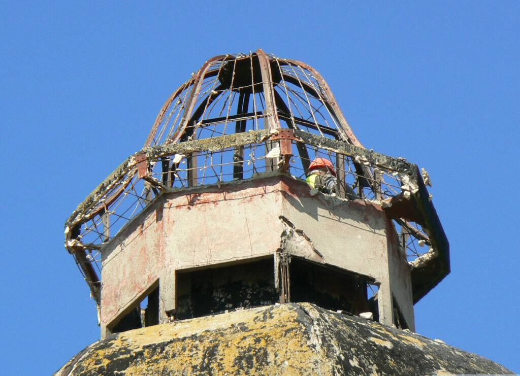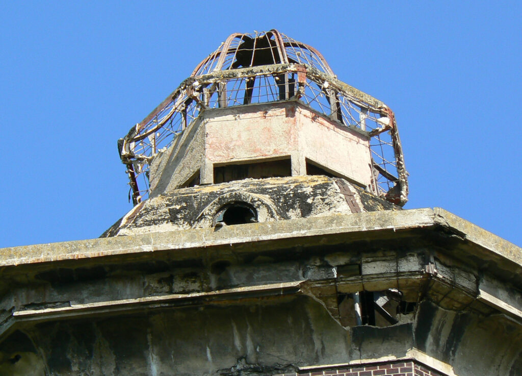 Pozbawiona „czapy” wieża została przykryta wykonanym przed operacją drewnianym daszkiem. I tak „udekorowana” stoi do dziś.
